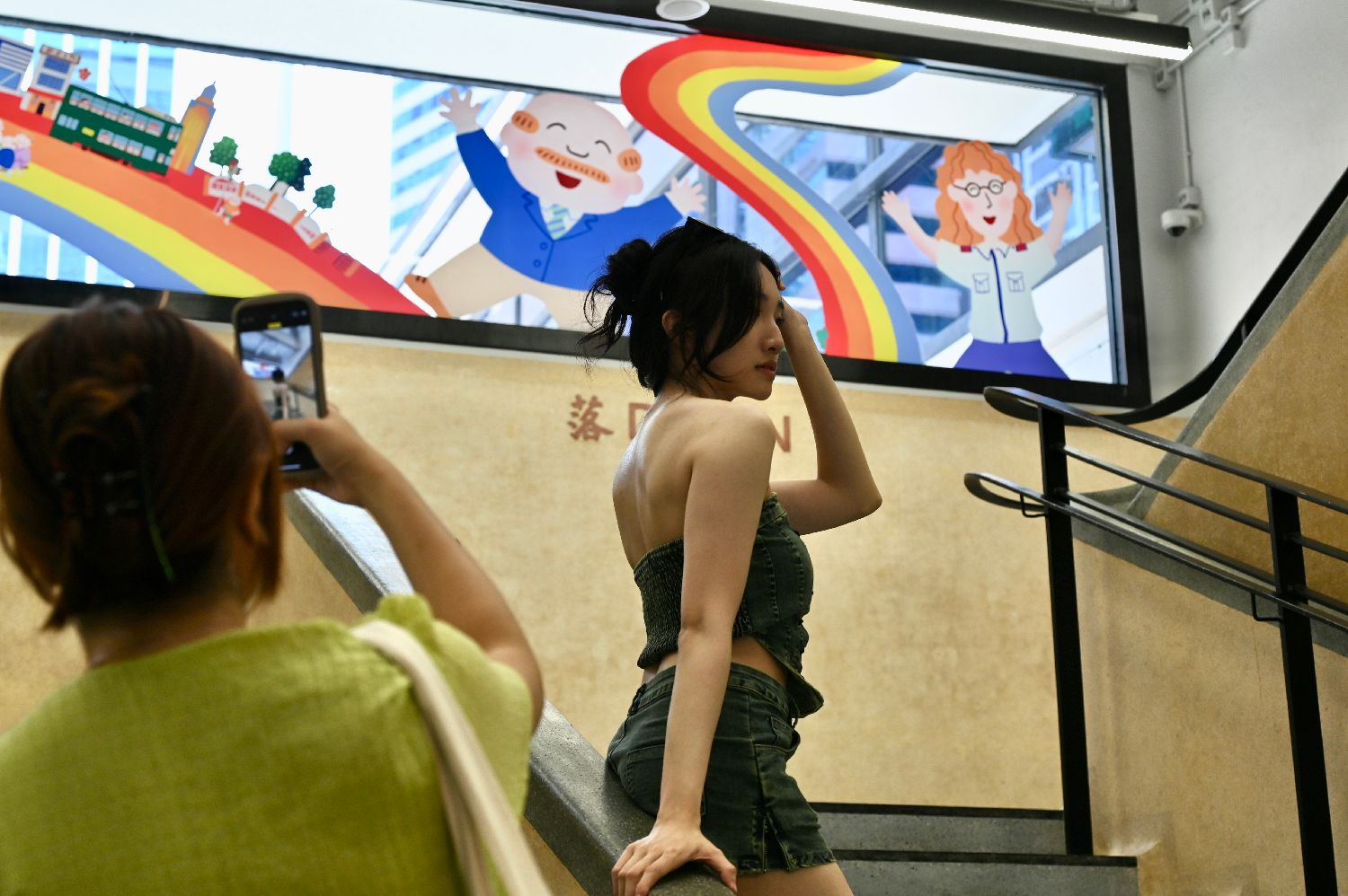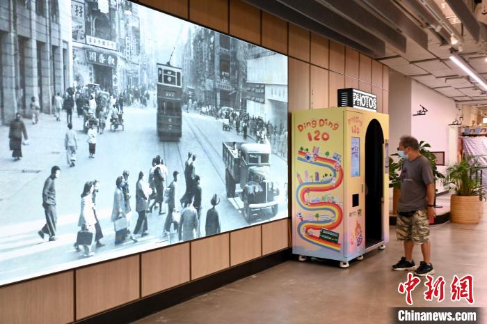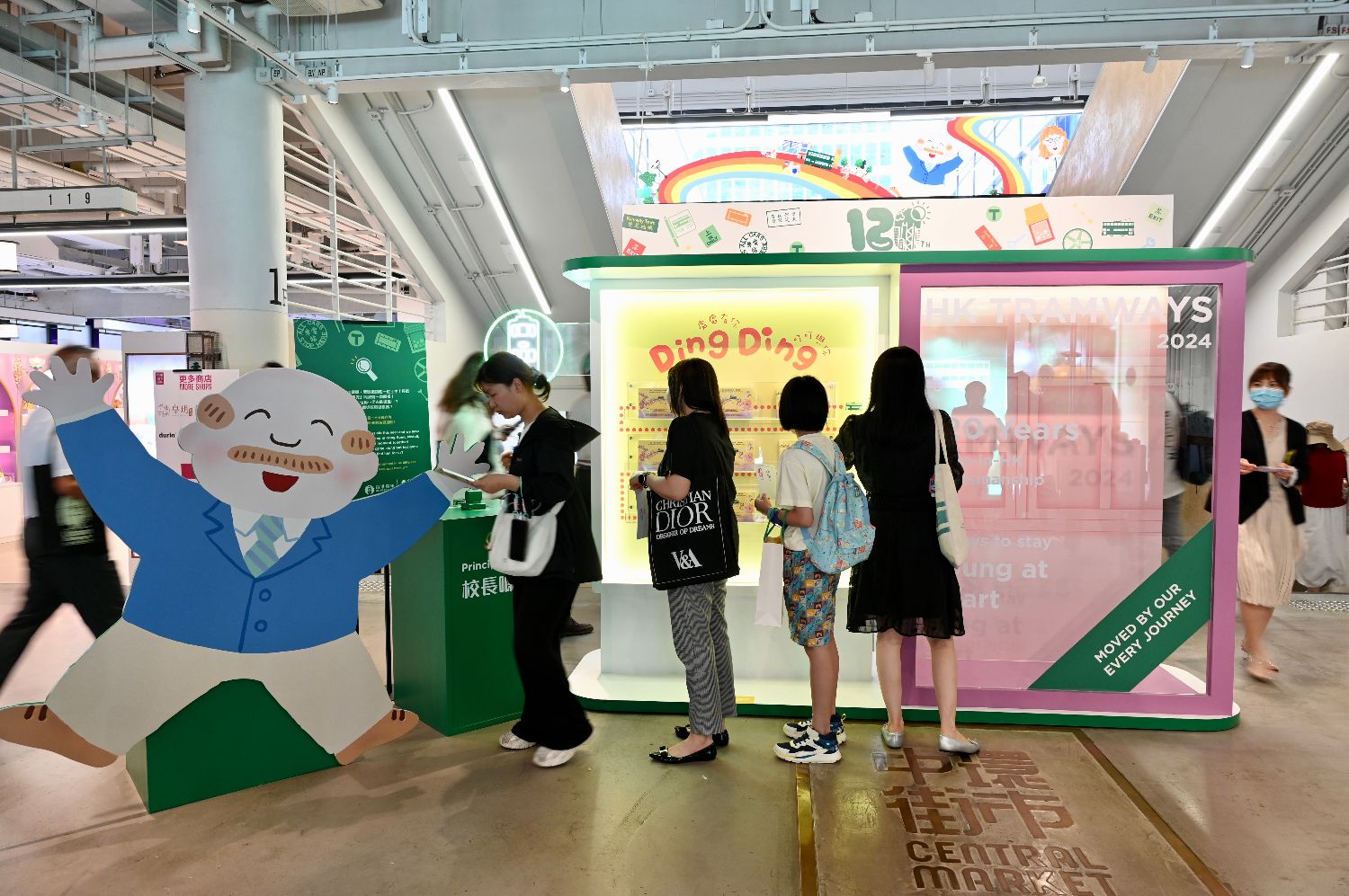 7月23日,香港电车为庆祝120周年,与香港经典卡通角色“麦兜”合作,在中环街市设置展览及限定活动,介绍香港电车的历史发展,并设有“打卡”位,供市民及游客与“麦兜”等卡通角色合影。图为香港中环街市的香港电车与“麦兜”等卡通角色吸引游客“打卡”。中新社