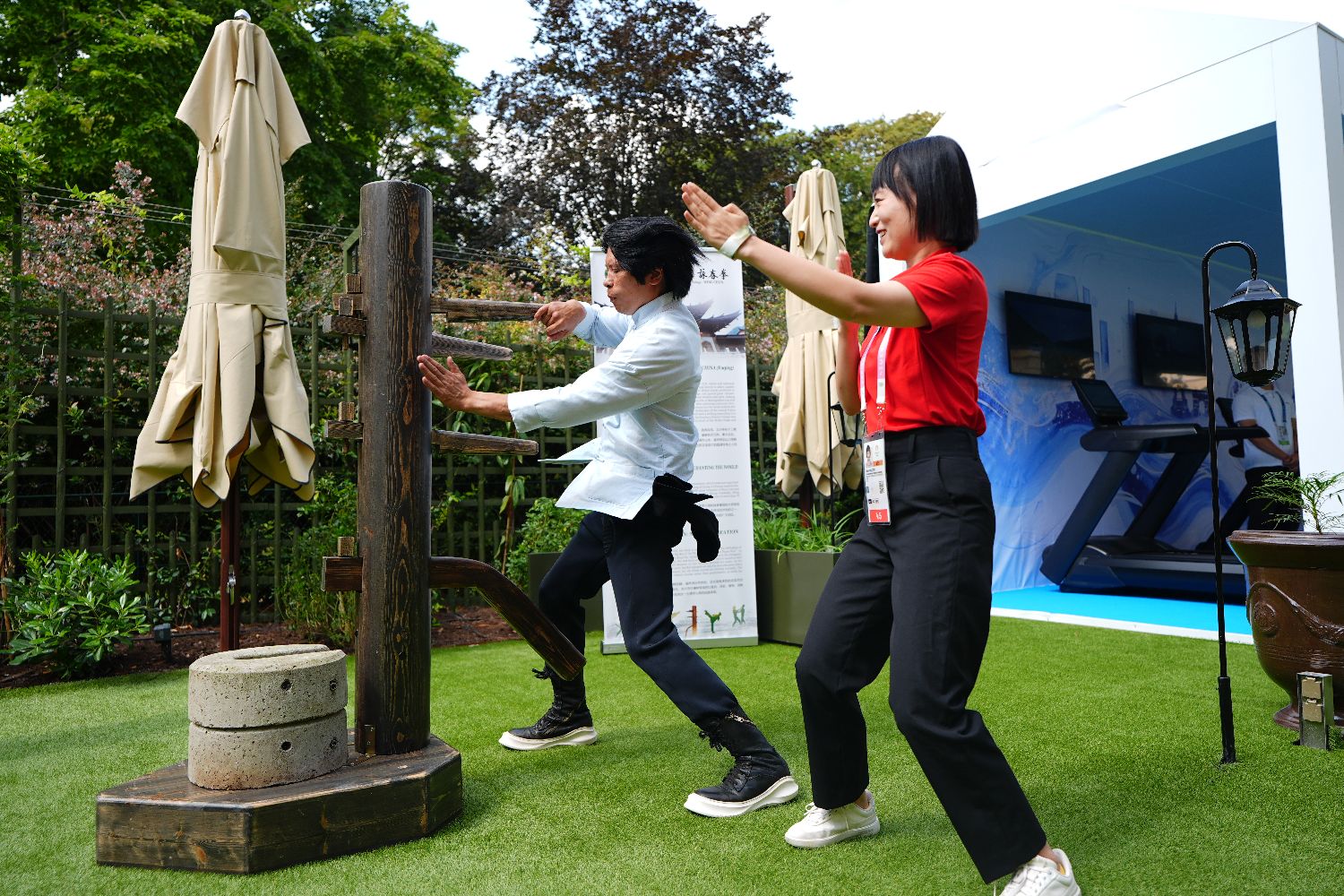 媒体记者在巴黎奥运会“中国之家”体验咏春拳。中新社