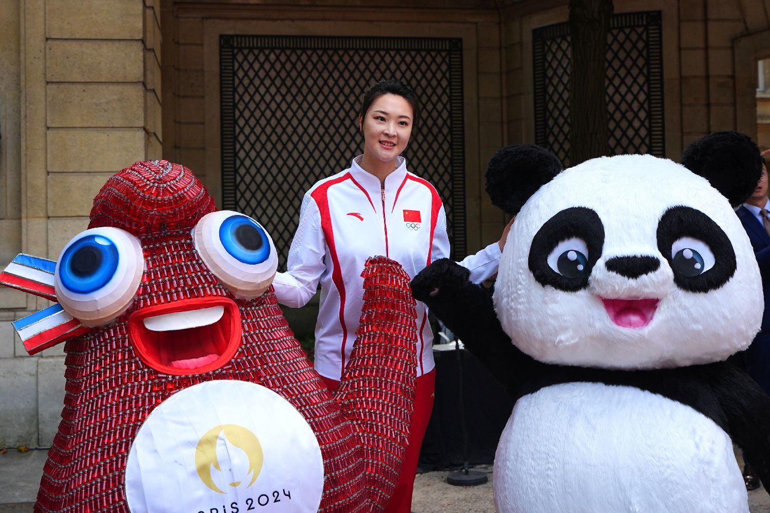 前中国女排队员惠若琪与巴黎奥运会吉祥物弗里热、熊猫合影。中新社