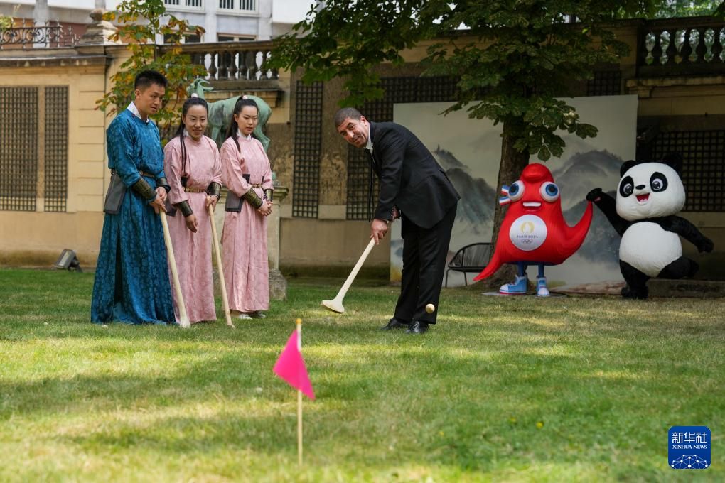 7月24日,一位工作人员(右一)在巴黎奥运会“中国之家”体验传统体育活动“捶丸”。新华社