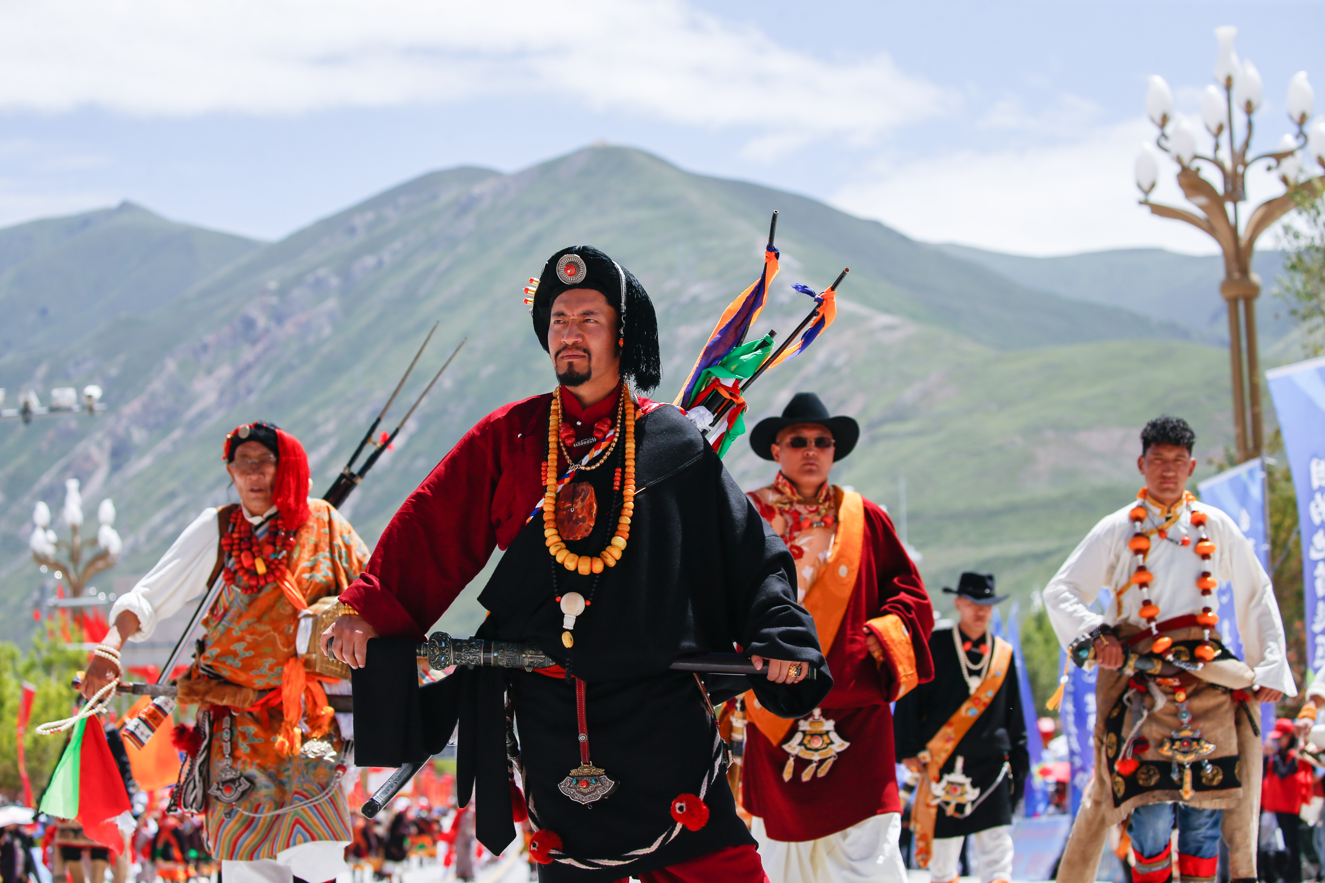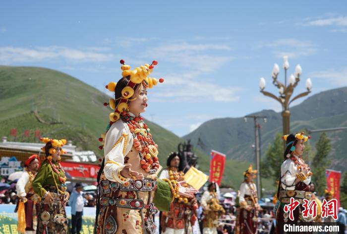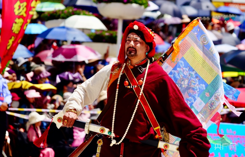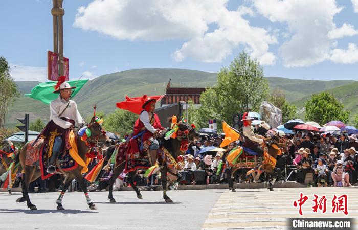 7月24日,“潇洒的康巴人”——中国国家级藏族文化(玉树)生态保护实验区创建成果非遗巡演在青海省玉树藏族自治州玉树市举行,身着华丽服饰的康巴藏族儿女将一台集康巴服饰、马术、歌舞以及非遗展示的节目以行走巡演的方式呈现给观众。图为巡演中的康巴汉子。中新社