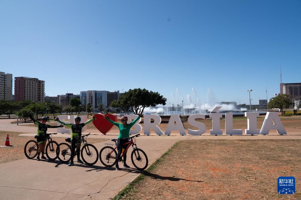 7月14日,几名自行车爱好者在巴西首都巴西利亚城市中轴线上留影。
