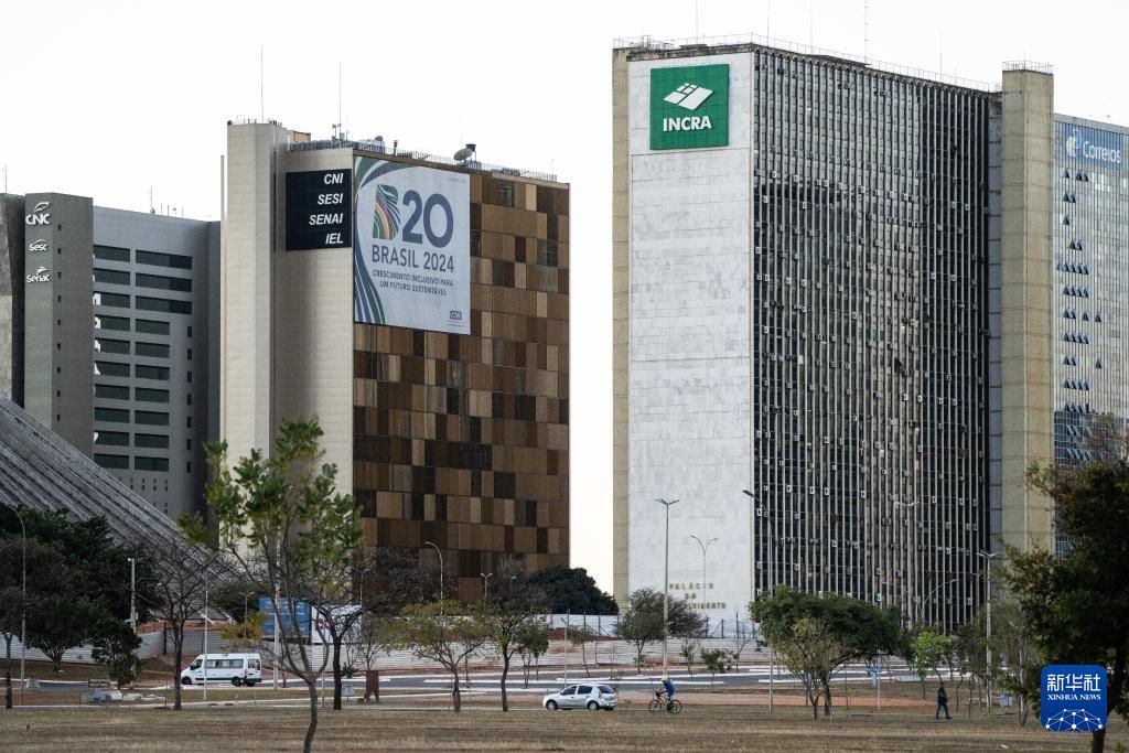 这是2024年7月14日在巴西首都巴西利亚拍摄的一座悬挂有“G20”标志性的建筑。