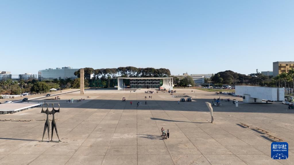 这是2024年7月16日在巴西首都巴西利亚拍摄的国会大厦以及三权广场(无人机照片)。