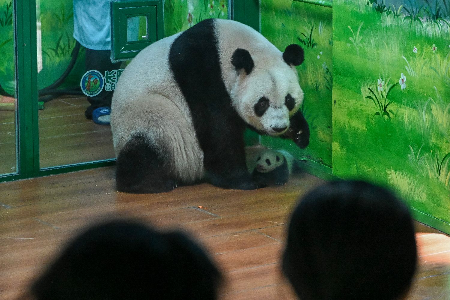 7月29日,在广东广州,全球唯一大熊猫三胞胎“萌帅酷”迎来十周岁生日,广州长隆野生动物世界为此举办庆生活动。吉尼斯世界纪录大中华区代表现场授予大熊猫三胞胎“首例繁殖成功的大熊猫三胞胎”“最长寿的大熊猫三胞胎”两项认证。图为大熊猫三胞胎中的“萌萌”与其幼崽。中新社