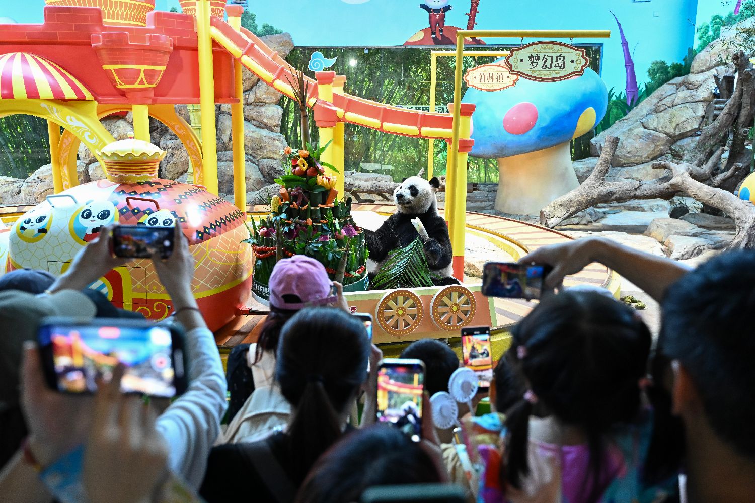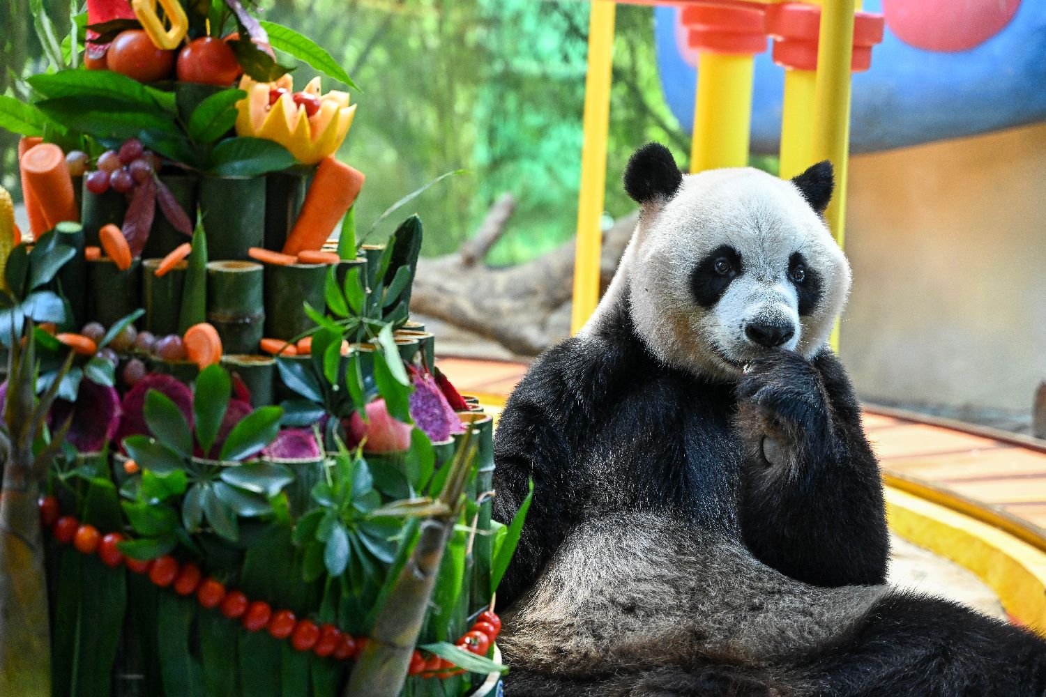 长隆野生动物世界为大熊猫举办了隆重的庆生活动。生日蛋糕是由蜂蜜水、水果块、竹笋、胡萝卜和竹子等“高端”食材制作而成,兼顾健康和美味,深受大熊猫们的喜爱。广州《羊城晚报》