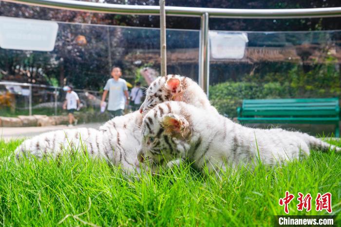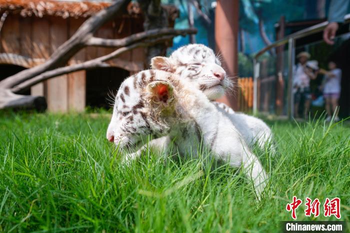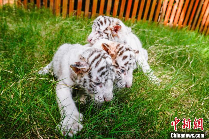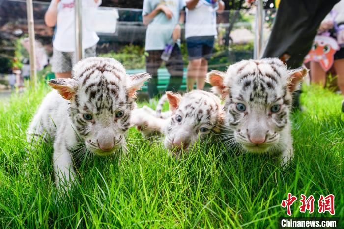 近日,在郑州银基动物王国主题乐园出生的孟加拉白虎“三胞胎”迎来满月。三只虎宝宝均为母虎,分别取名“奶油”“奶茶”“奶酪”。在保育团队的照料下,小白虎们食量渐增,时而相互依偎嬉戏,时而“招手”与游客互动,时而发呆尽享“日光浴”,动静之间,憨态可掬,吸引游客驻足围观。图为三只小白虎在草坪上相互依偎。