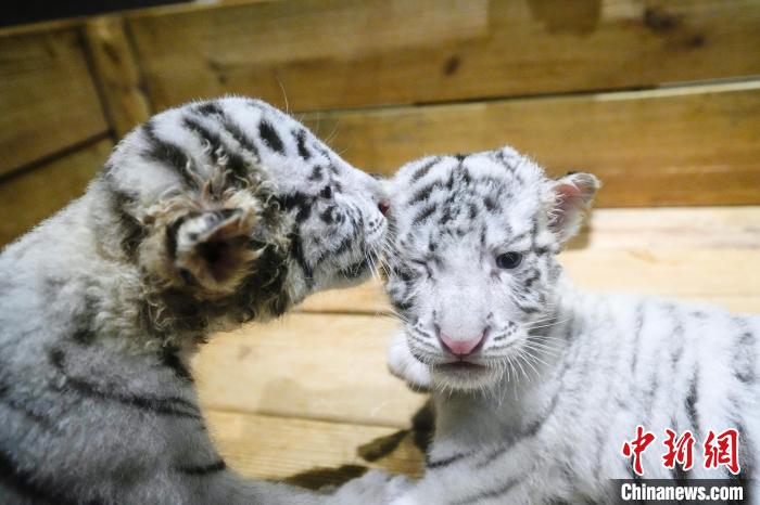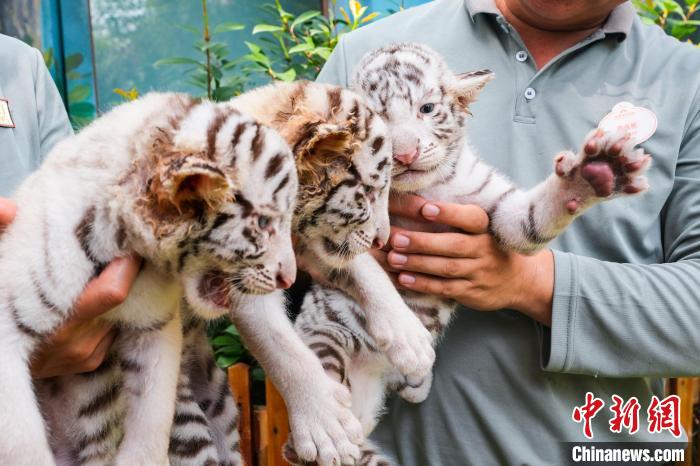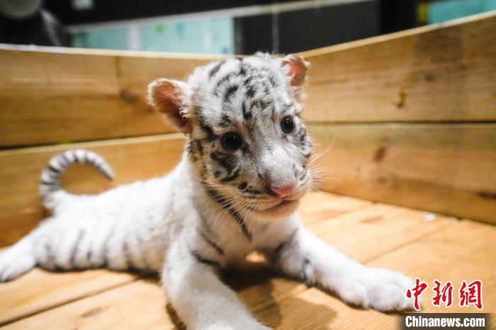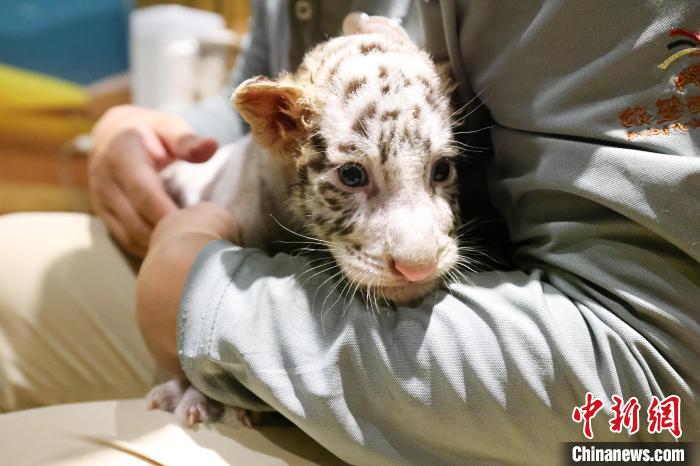 小白虎在工作人员怀抱里向游客“打招呼”。