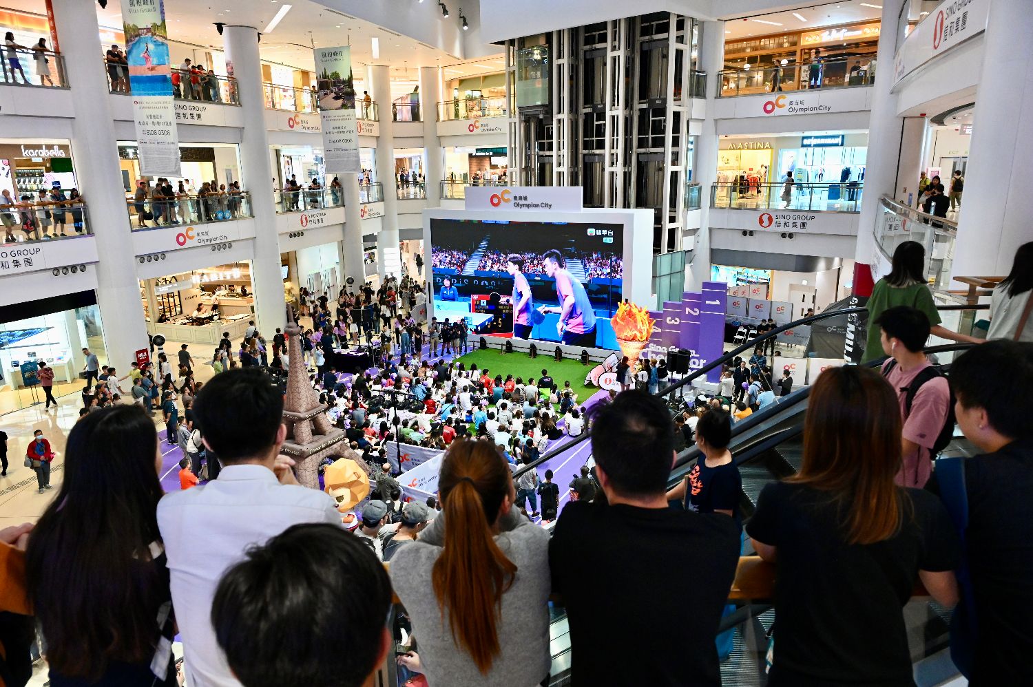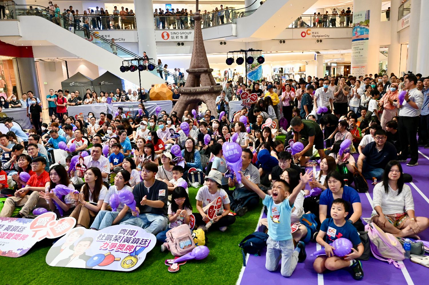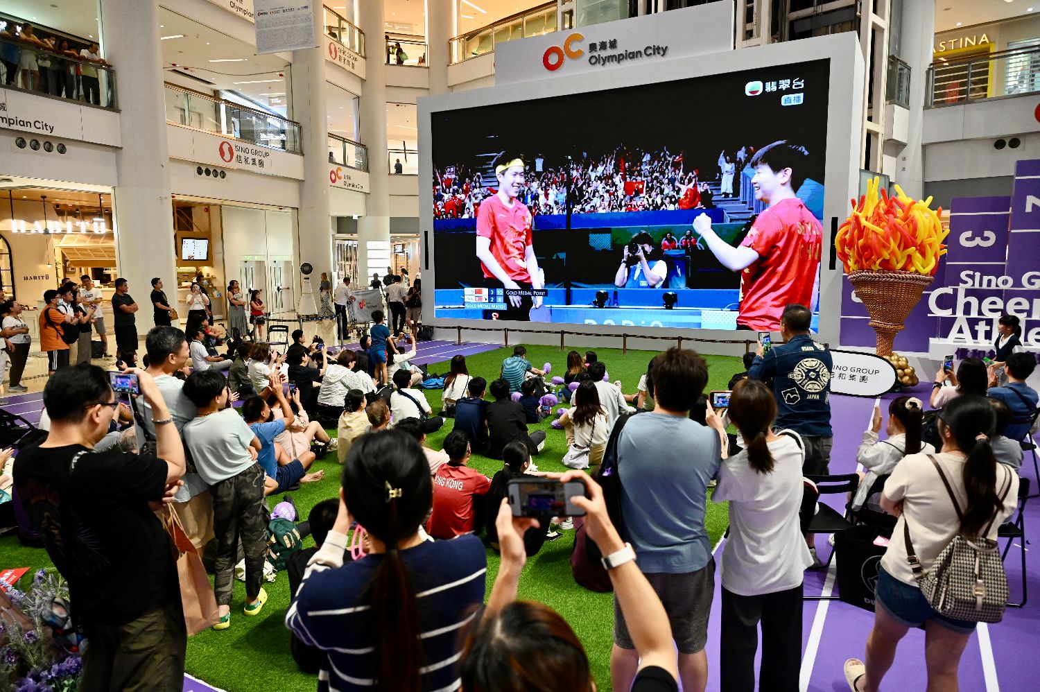 7月30日晚,中国香港选手杜凯琹/黄镇廷出战巴黎奥运会乒乓球混双铜牌赛。图为赛事吸引大批市民到商场观看。中新社
