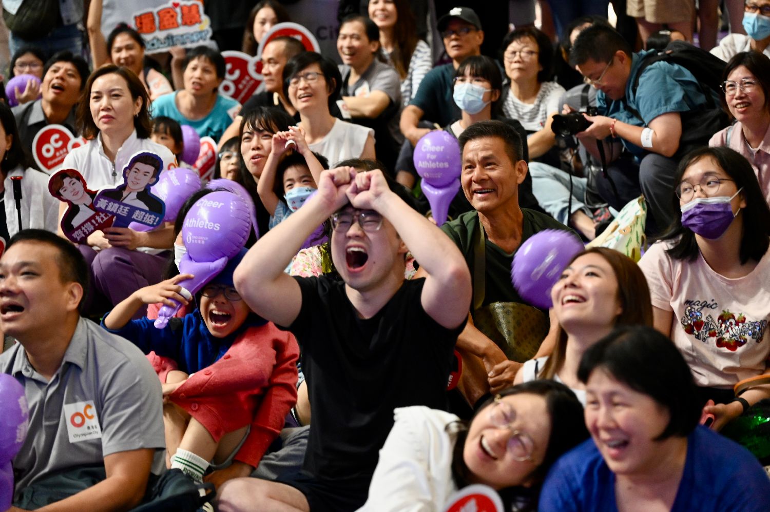 7月30日晚,大批香港市民关注中国香港选手杜凯琹/黄镇廷出战的巴黎奥运会乒乓球混双铜牌赛及中国组合王楚钦/孙颖莎出战的乒乓球混双冠军赛。最终杜凯琹/黄镇廷不敌韩国组合,无缘奖牌;中国组合王楚钦/孙颖莎以4:2力挫朝鲜组合夺冠。图为香港市民观看中国组合王楚钦/孙颖莎夺冠一刻。中新社