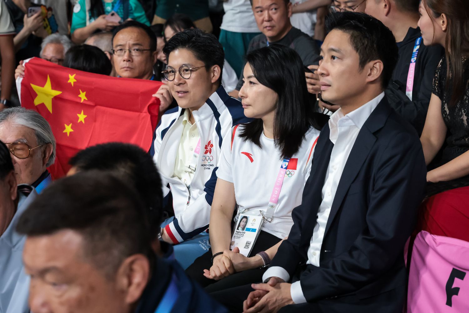 7月30日,巴黎奥运会举行乒乓球混合双打决赛,霍启刚、郭晶晶、霍启山在现场观看比赛,并为运动员加油。香港中通社