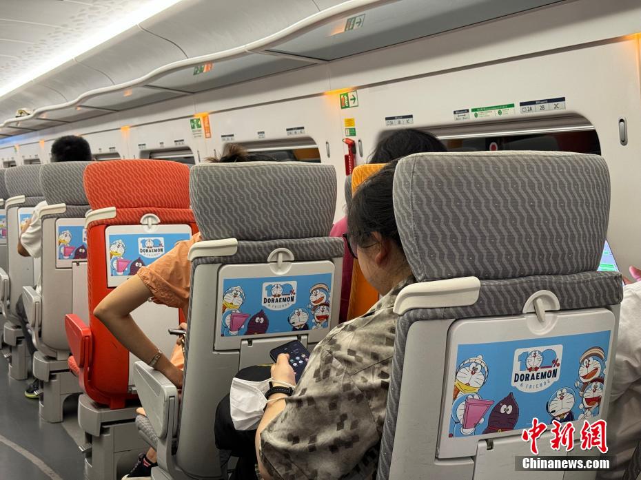 主题列车内贴在椅背小桌板处的“哆啦A梦”图案。中新网