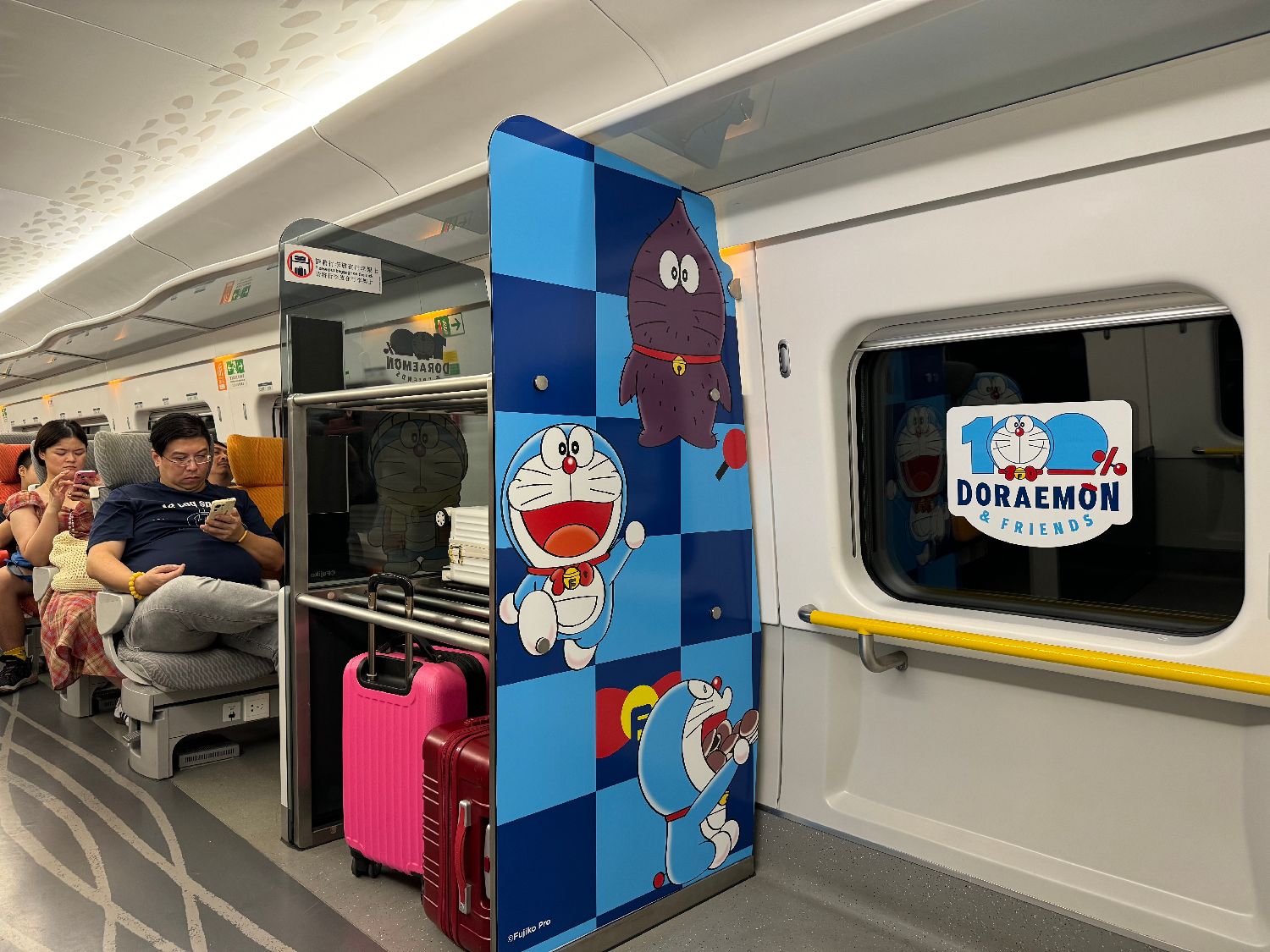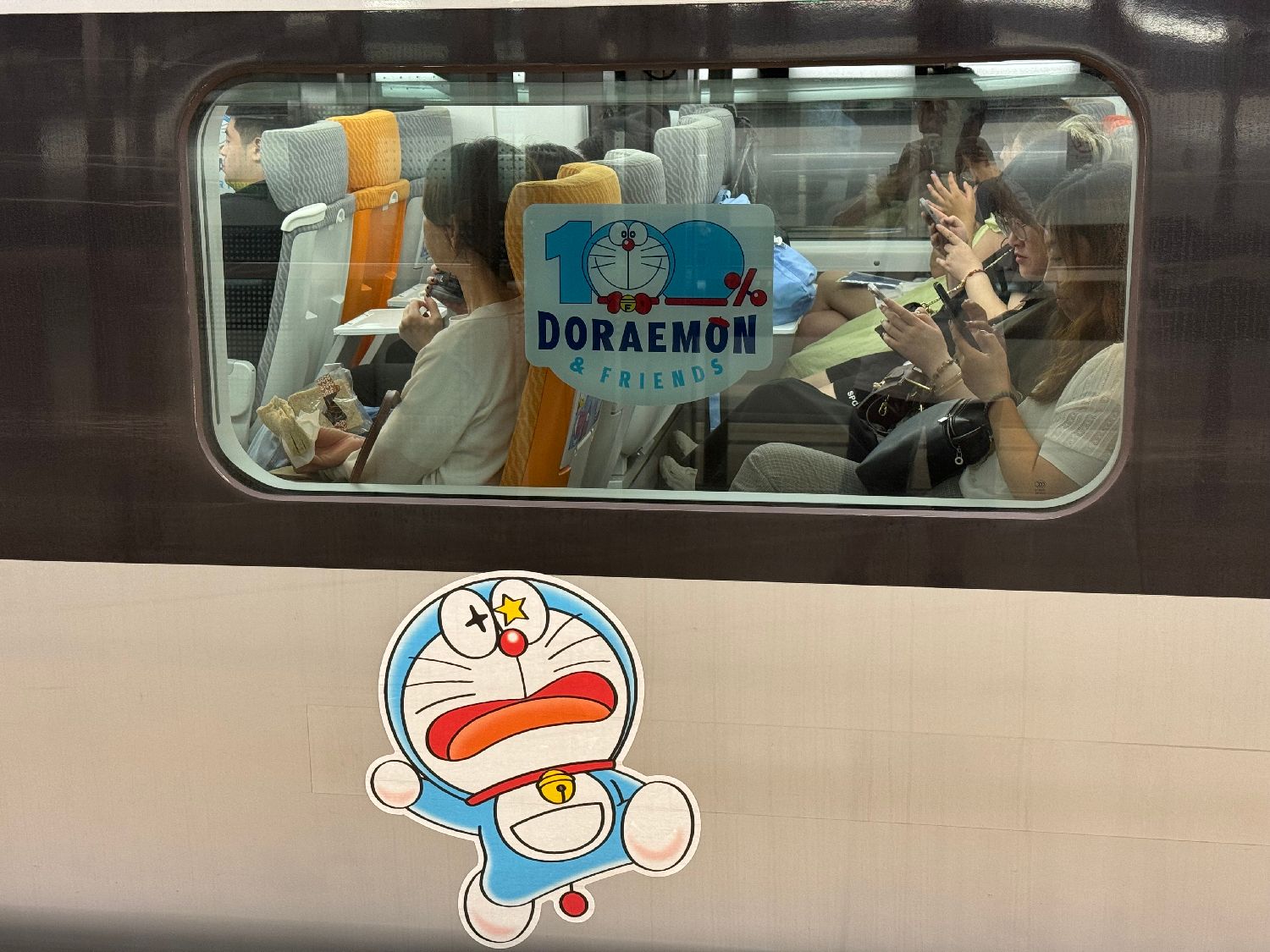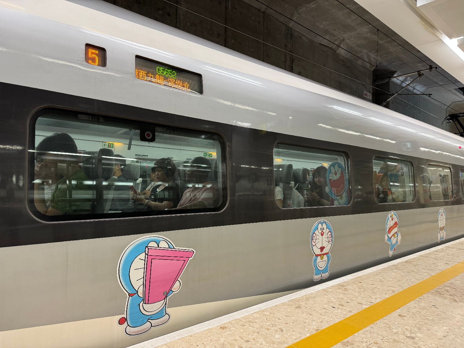 近日,“哆啦A梦”主题列车在广深港高铁正式上线运营。据悉,7月27日至8月18日,部分香港西九龙站往来广州南站、深圳北站及福田站的班次由高铁“100%哆啦A梦&FRIENDS”主题列车行驶,为乘客旅途添“萌”趣。此外,还有“哆啦A梦”大电影版雕塑联同多款主题装饰进驻香港西九龙站。图为主题列车上的“哆啦A梦”图案。中新社