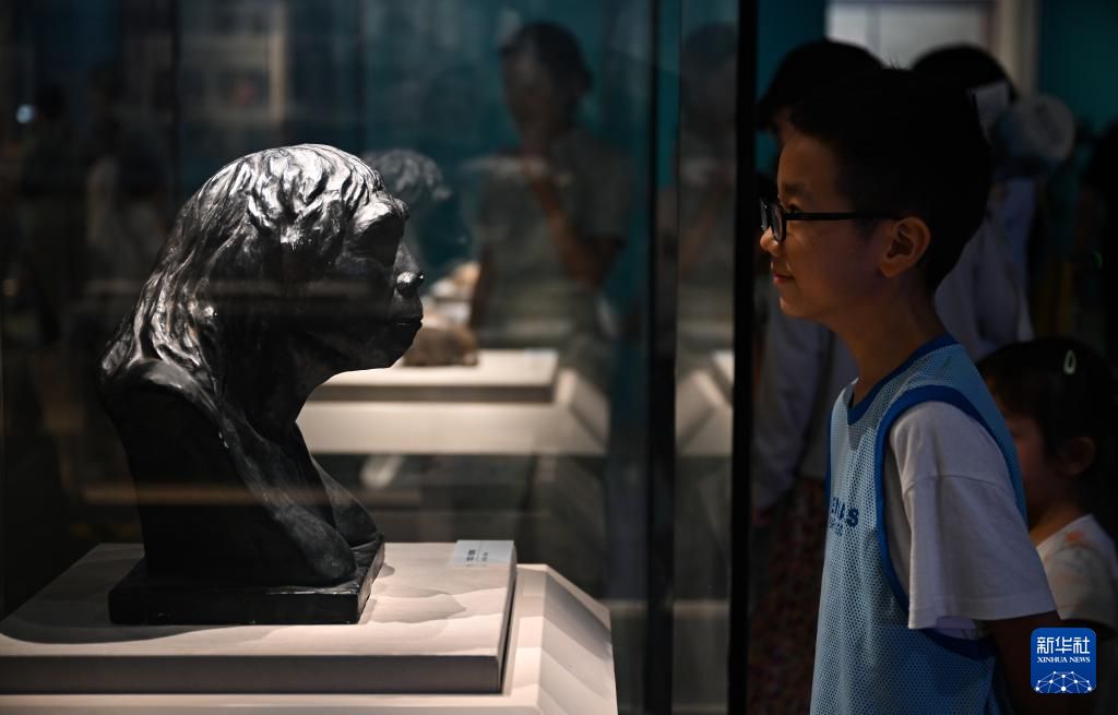 7月30日,一名小朋友在展览上观看“北京人”复原像。新华社