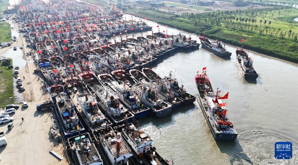 7月31日,江苏省连云港市赣榆区青口中心渔港内的渔船整装待发(无人机照片)。
