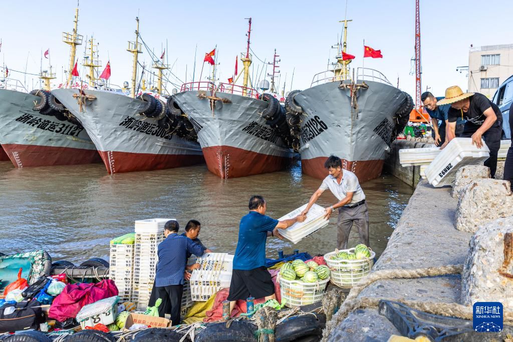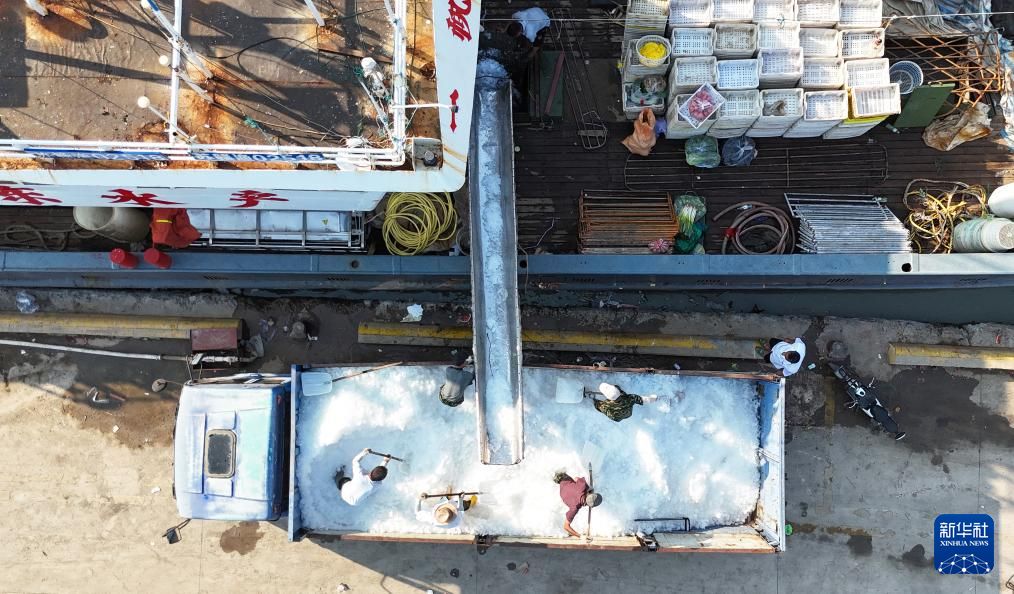 7月31日,在江苏省连云港市赣榆区青口中心渔港,渔民向渔船上装载冰块(无人机照片)。