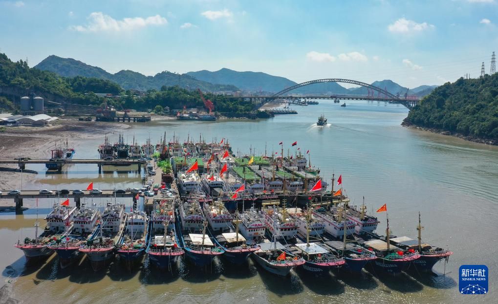 7月31日,浙江省台州市三门县健跳镇渔港内的渔船整装待发(无人机照片)。