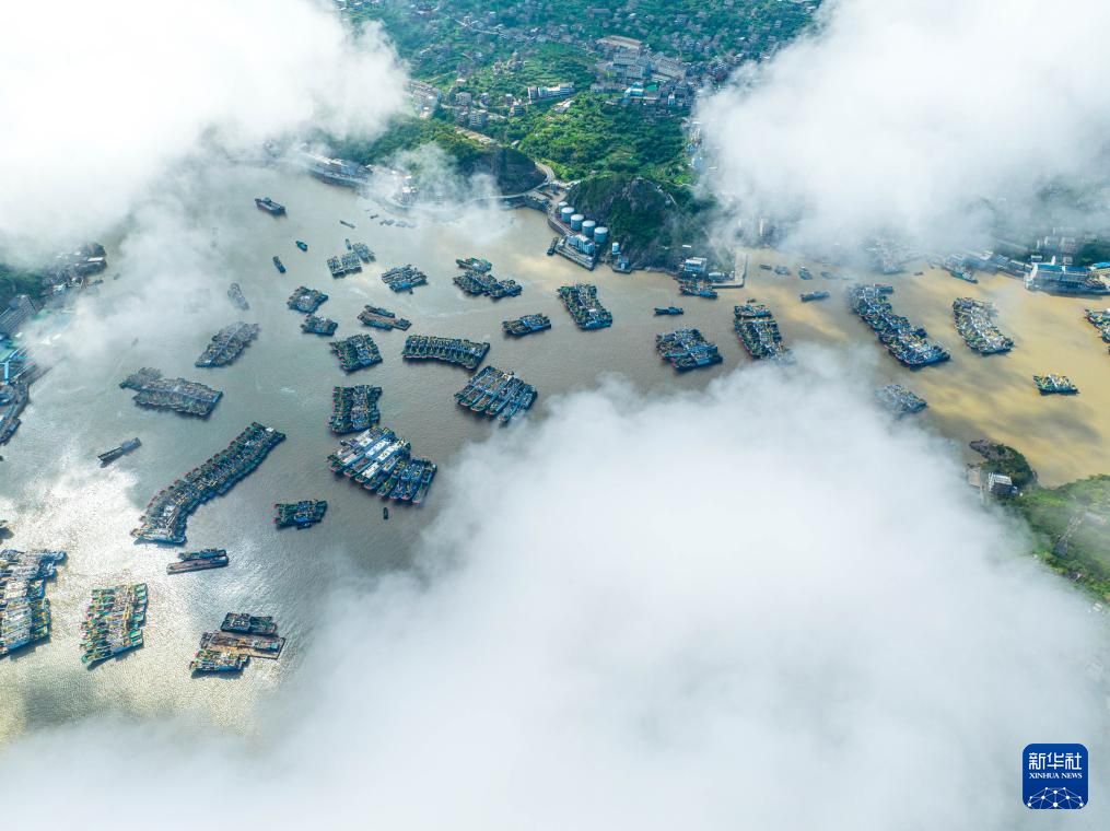 7月31日,浙江省温岭市石塘镇钓浜港内的渔船整装待发(无人机照片)。