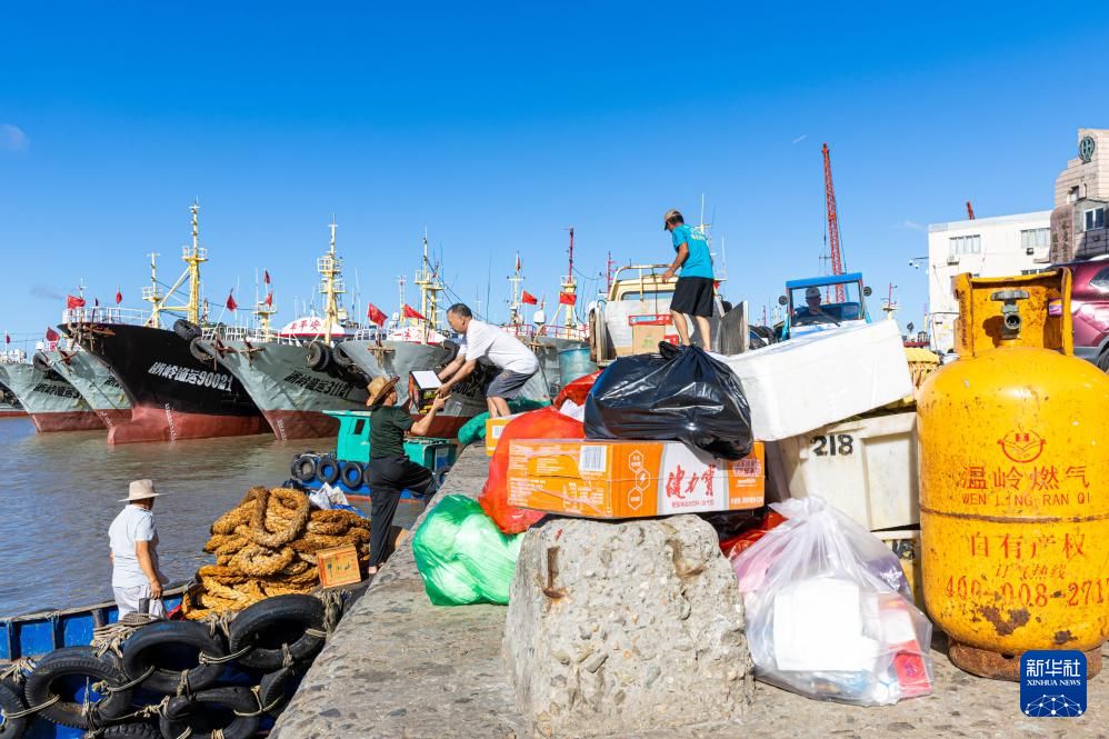 7月31日,在浙江省温岭市石塘镇钓浜港内,渔民抓紧时间装载生产生活用具。