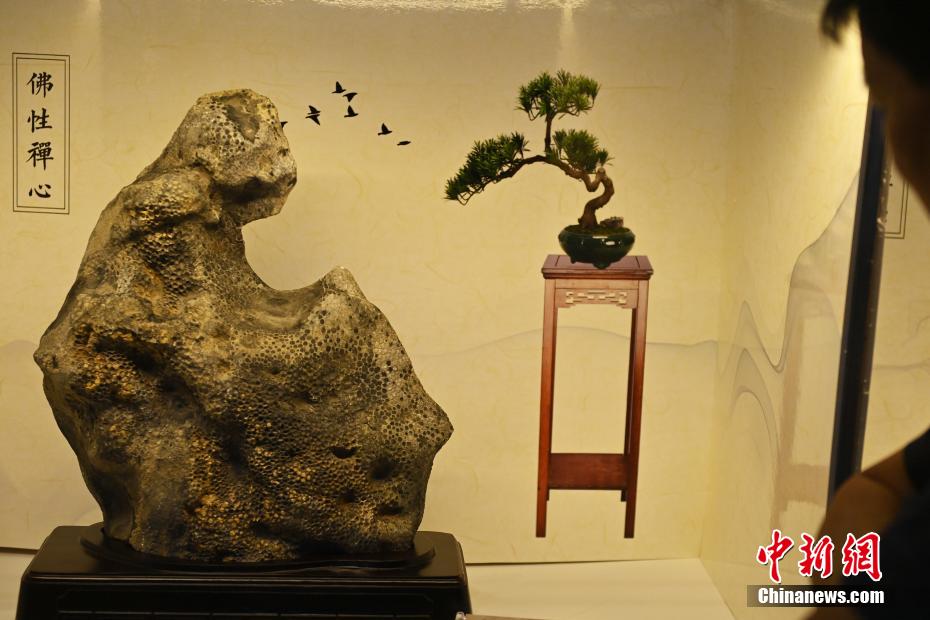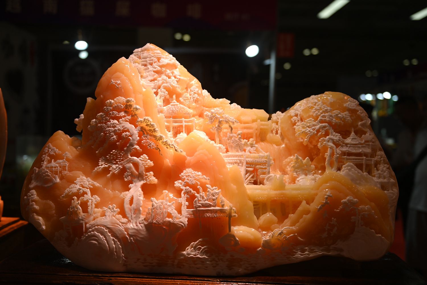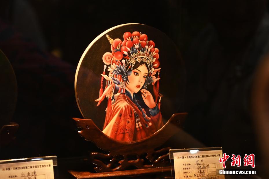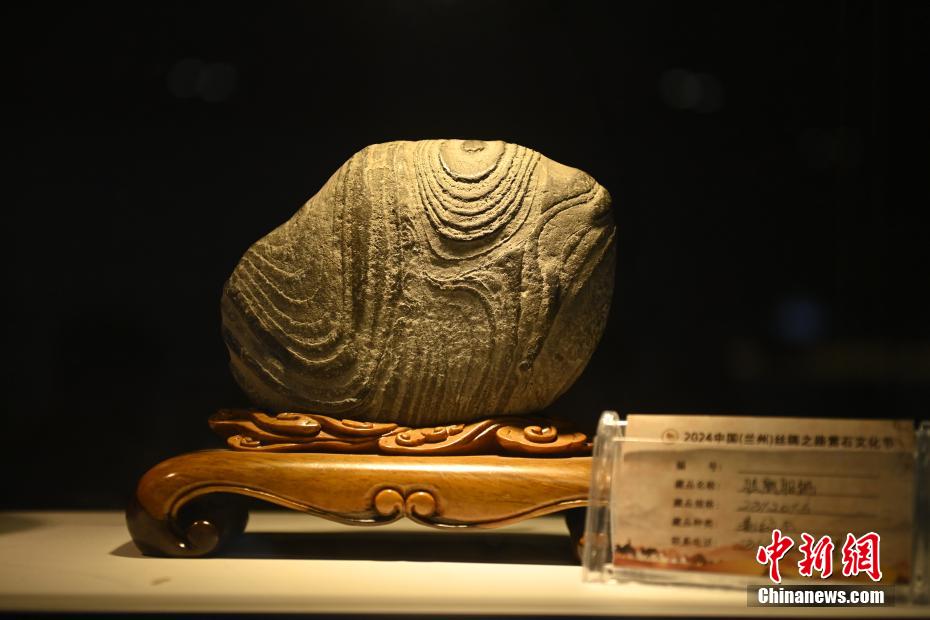 8月1日,以“文博丝路·盛世收藏”“天成大美·万域心声”为主题的2024第17届中国(兰州)艺术品收藏博览会暨丝绸之路国际赏石文化节在甘肃兰州开幕。展览分为“天地灵韵·造化人文”奇石展、“五彩禀赋·天地宠儿”嘉陵彩专展、“石上匠心·创美传承”石艺作品展、“明心见性·妙悟人生”禅石展等。图为参观者拍摄《陈酿老酒》等石艺作品。中新社