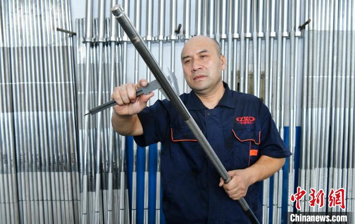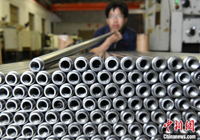 8月1日,河北杠铃企业工作人员查看杠铃杆外表光洁度。中新网