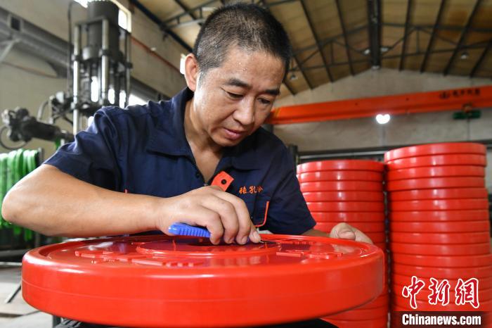8月1日,河北杠铃企业工作人员在处理杠铃片边缘。中新网
