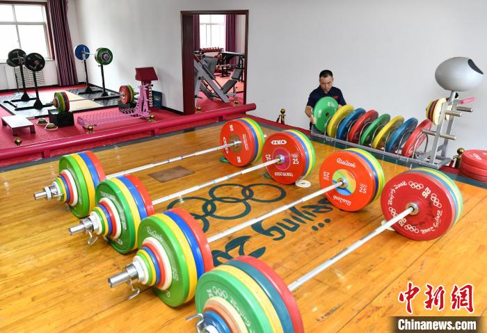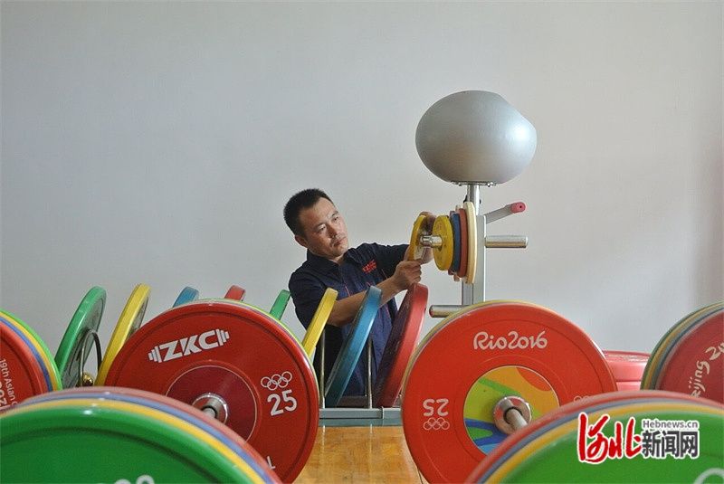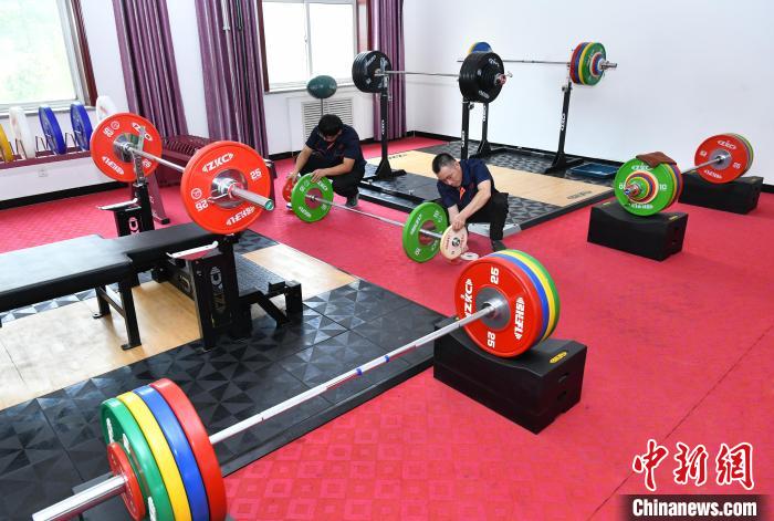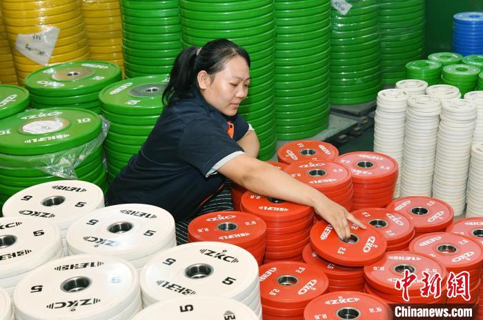 8月1日,河北杠铃企业工作人员在安装杠铃片。中新网