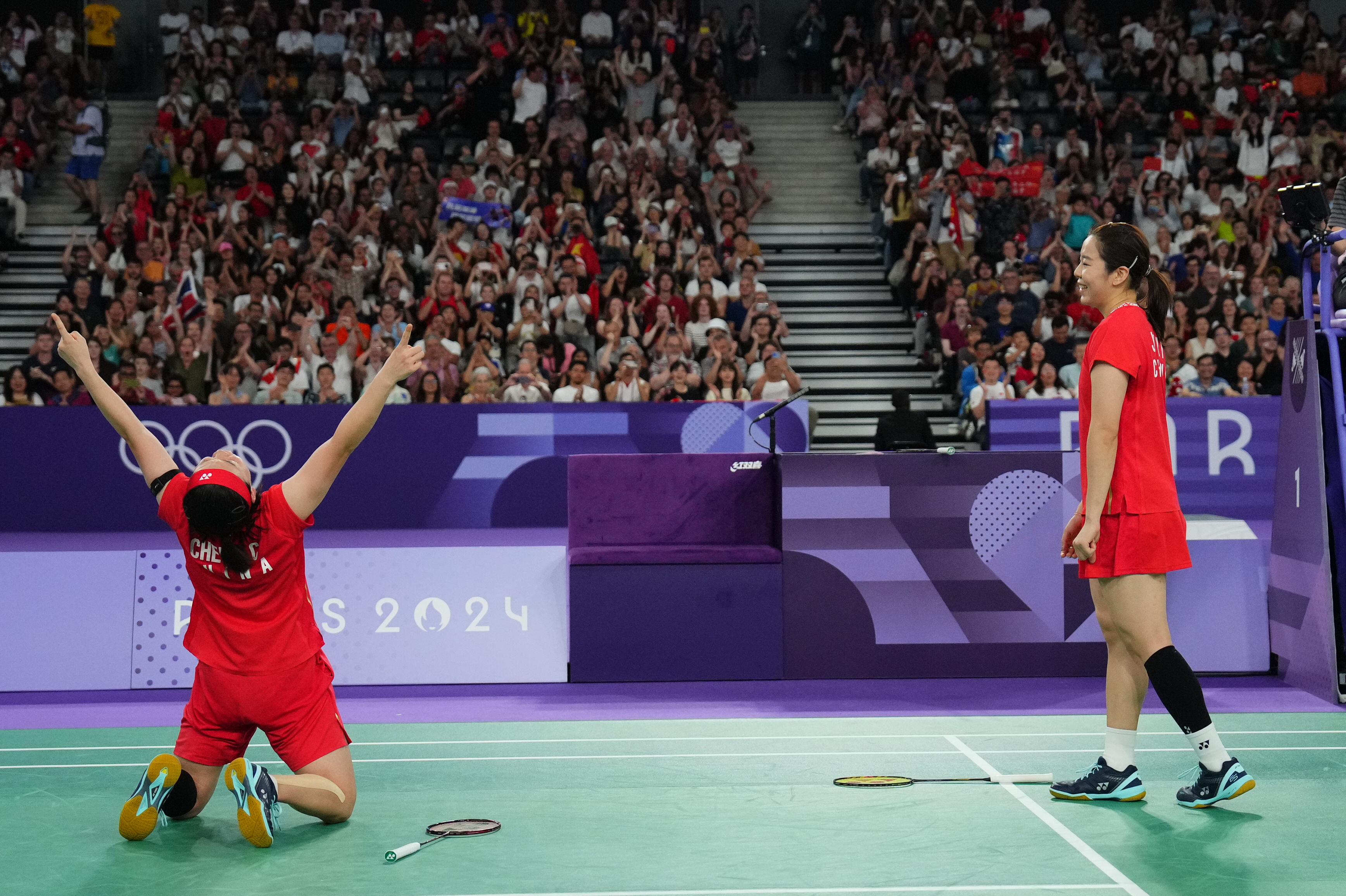 当地时间8月3日,在巴黎奥运会羽毛球女子双打比赛中,中国组合陈清晨/贾一凡2比0胜中国组合刘圣书/谭宁,获得金牌。图为陈清晨/贾一凡(右)庆祝胜利。中新社