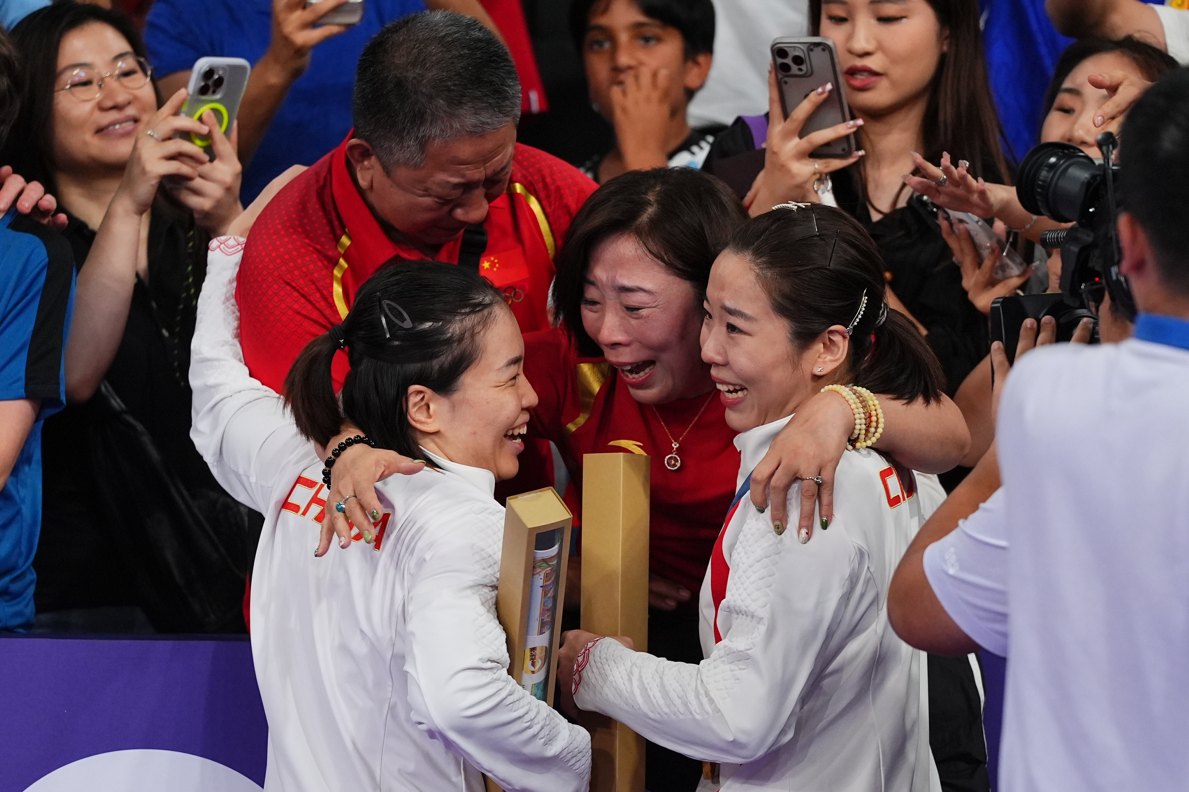当地时间8月3日,在巴黎奥运会羽毛球女子双打比赛中,中国组合陈清晨/贾一凡2比0胜中国组合刘圣书/谭宁,获得金牌。图为陈清晨/贾一凡(右)与贾一凡父母拥抱。中新社