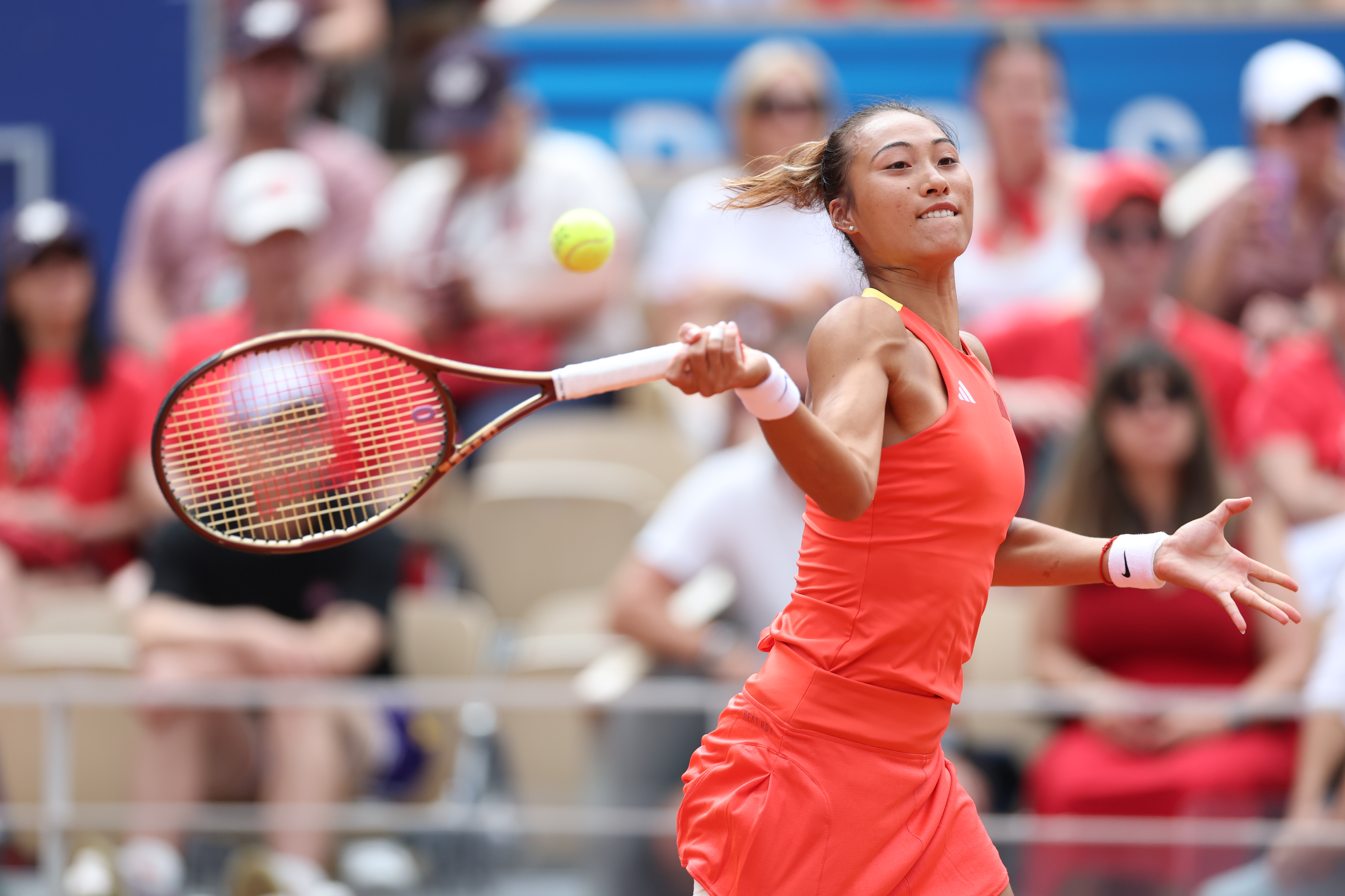 当地时间8月3日,在巴黎奥运会网球女子单打比赛中,中国选手郑钦文2比0胜克罗地亚选手维基奇,获得金牌。图为郑钦文在比赛中。中新社