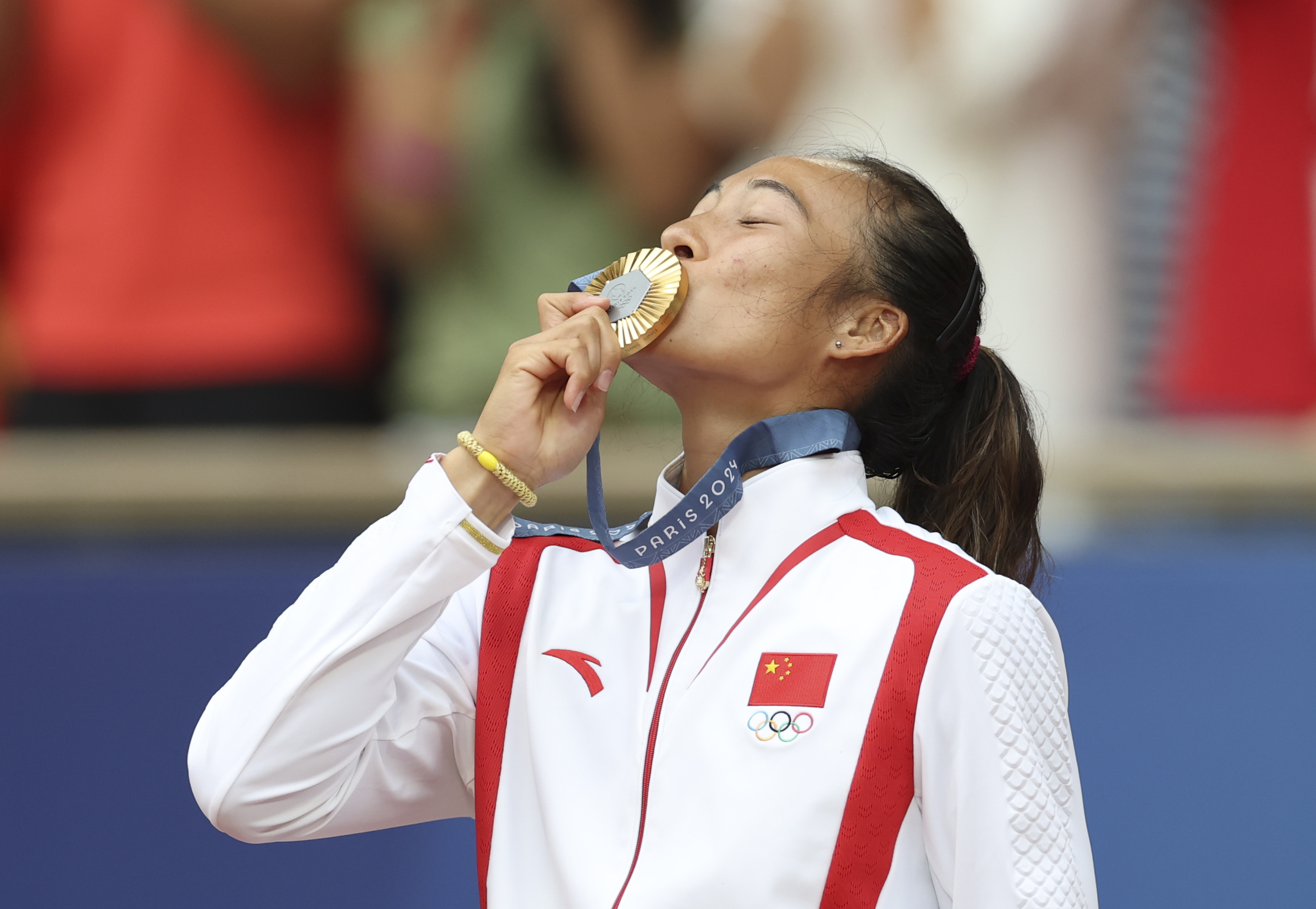 当地时间8月3日,在巴黎奥运会网球女子单打比赛中,中国选手郑钦文2比0胜克罗地亚选手维基奇,获得金牌。图为郑钦文亲吻金牌。中新社