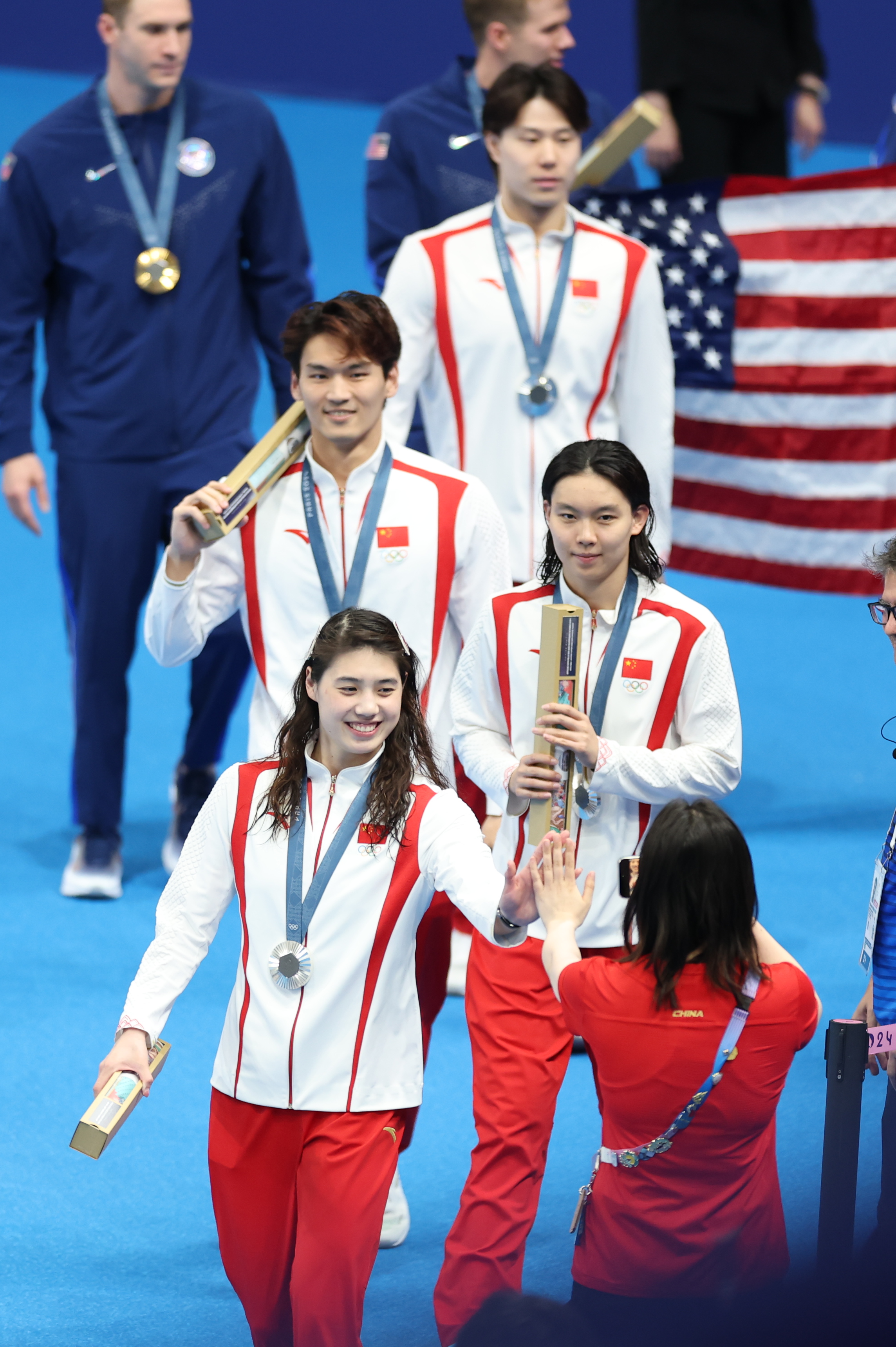 当地时间8月3日,在巴黎奥运会男女4x100米混合泳接力决赛中,中国选手张雨霏、杨浚瑄、徐嘉余、覃海洋(从前至后)以3分37秒55的成绩,获得亚军。中新社