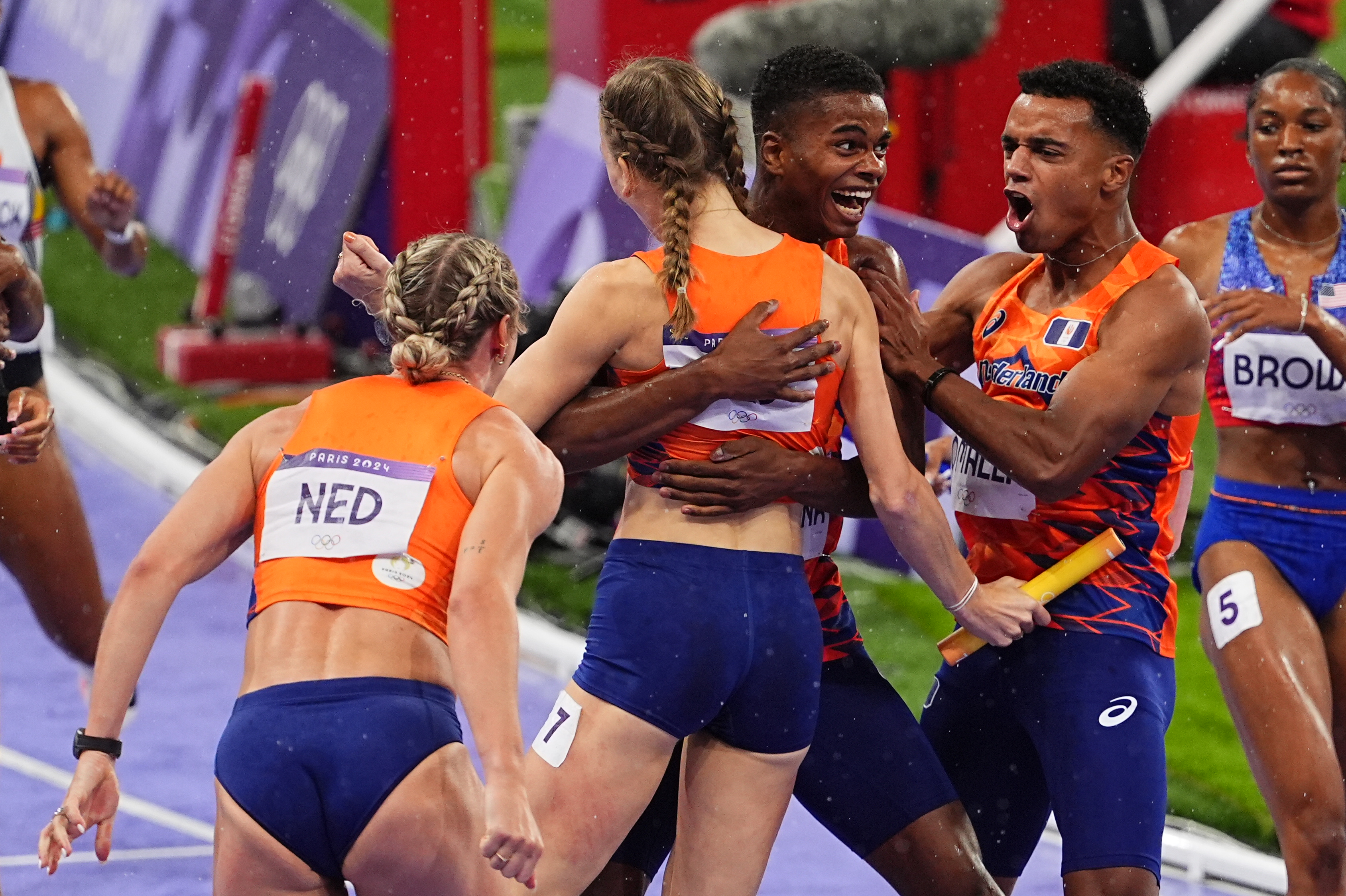 当地时间8月3日,在巴黎奥运会田径男女混合4X400米接力决赛中,荷兰队夺得冠军。图为荷兰队员庆祝夺冠。中新社