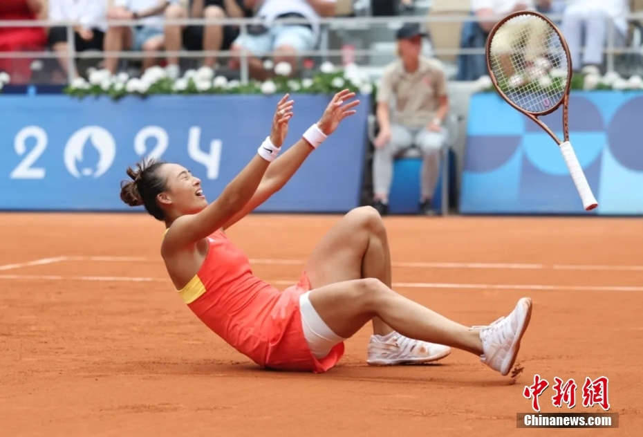 当地时间8月3日,在巴黎奥运会网球女子单打比赛中,中国选手郑钦文2比0胜克罗地亚选手维基奇,获得金牌。图为郑钦文庆祝比赛胜利。中新网