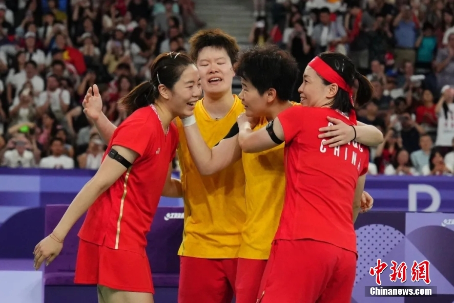 当地时间8月3日,在巴黎奥运会羽毛球女子双打比赛中,中国组合陈清晨/贾一凡2比0胜中国组合刘圣书/谭宁,获得金牌。图为陈清晨、谭宁、刘圣书、贾一凡(从右至左)赛后庆祝。中新网
