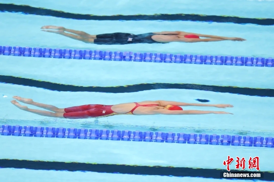 当地时间8月3日,在巴黎奥运会女子200米个人混合泳决赛中,中国选手余依婷获得第四名。图为余依婷(下)在比赛中。中新网