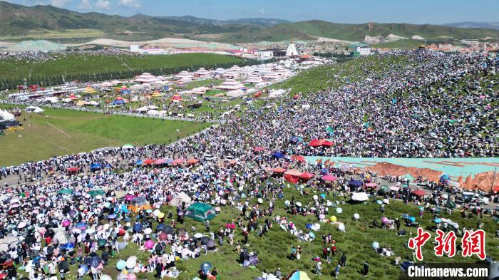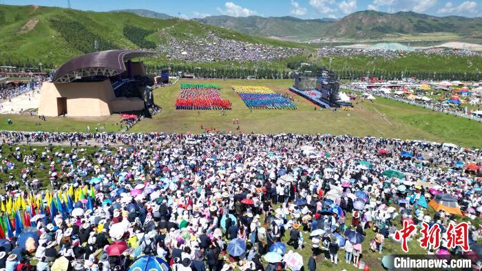 8月4日,第22届九色甘南香巴拉旅游艺术节在甘肃省甘南藏族自治州当周草原开幕。人们身着节日盛装载歌载舞、欢聚一堂,马队巡游、千人锅庄舞等活动精彩上演。九色甘南香巴拉旅游艺术节既是民众浪山聚会的节日盛会,也是展现发展成就、扩大对外开放的重要窗口,更是展示民俗文化、促进广泛交往交流交融的有效载体。图为民众在当周草原浪山聚会。(无人机照片)中新网