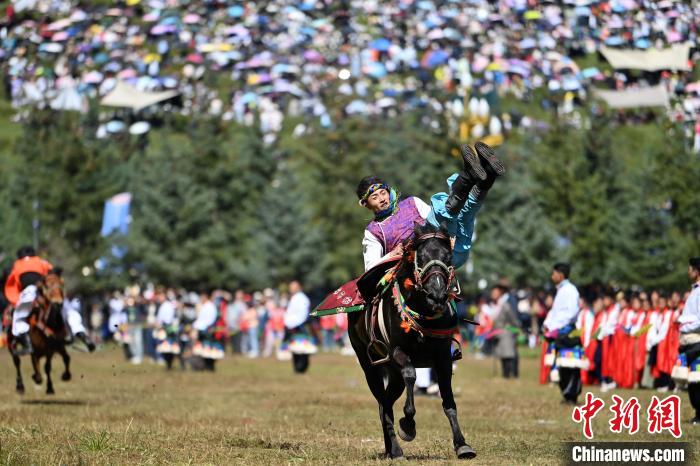 藏族骑手在当周草原上表演马术。中新网