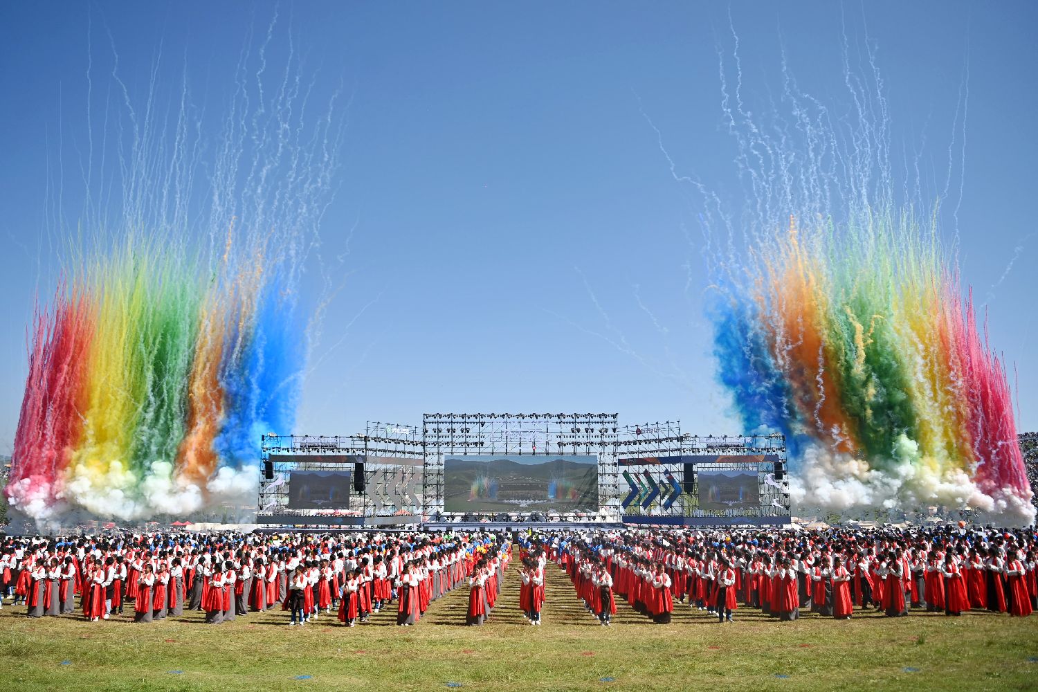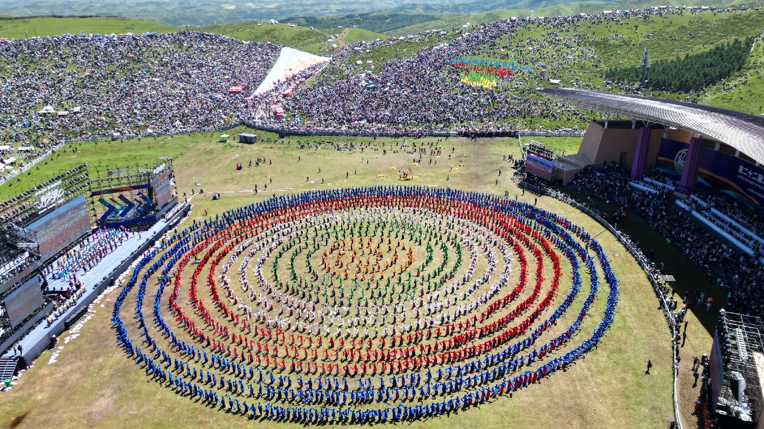 开幕式现场的千人锅庄舞表演。(无人机照片)中新社