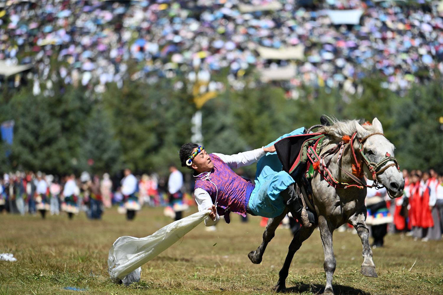 藏族骑手在当周草原上表演马术。中新社
