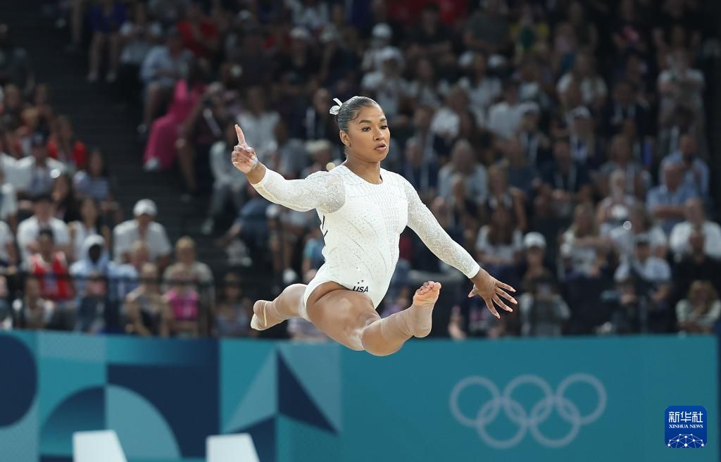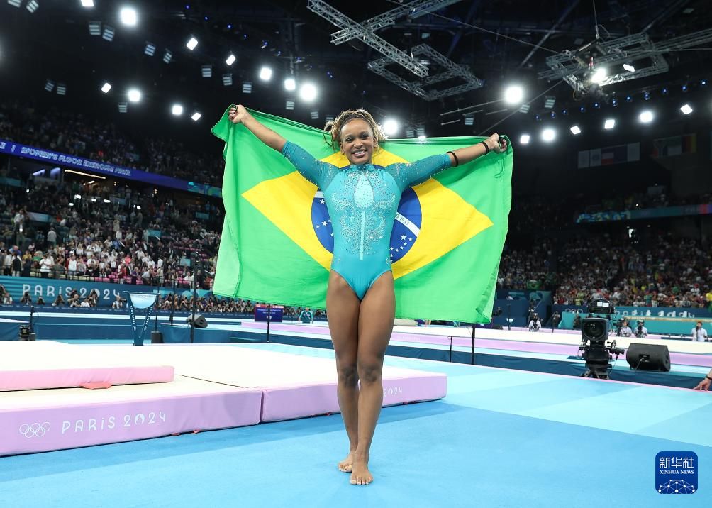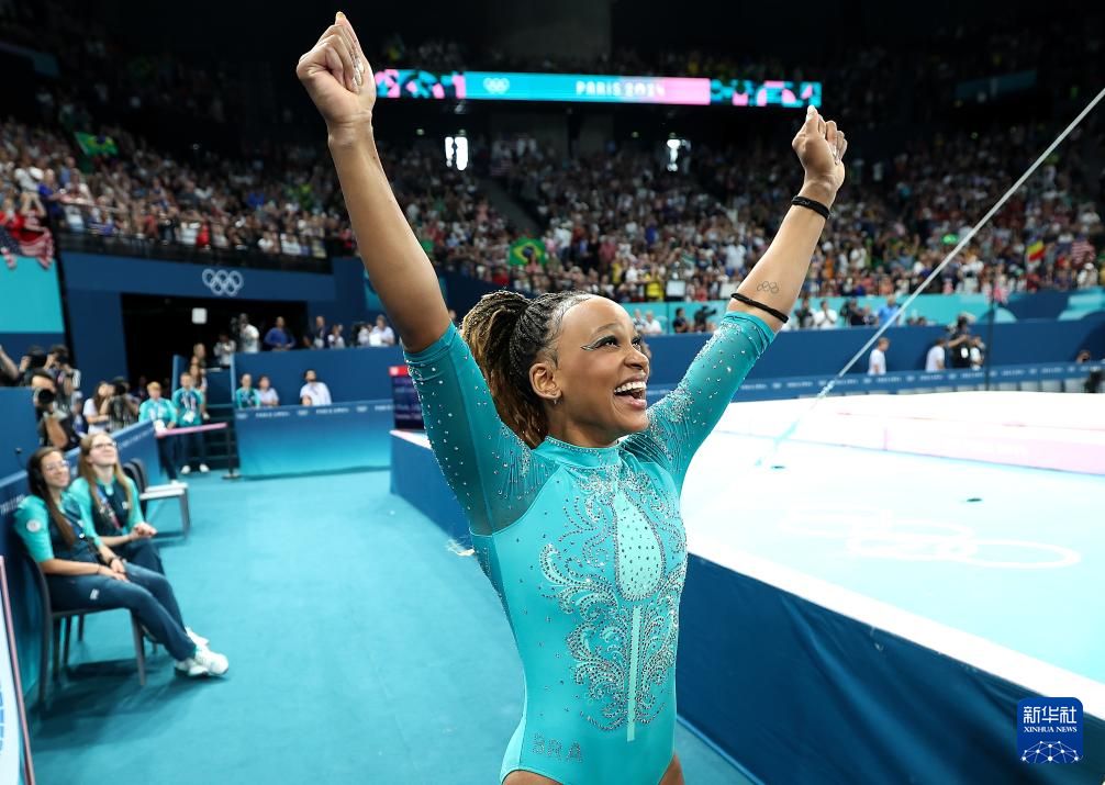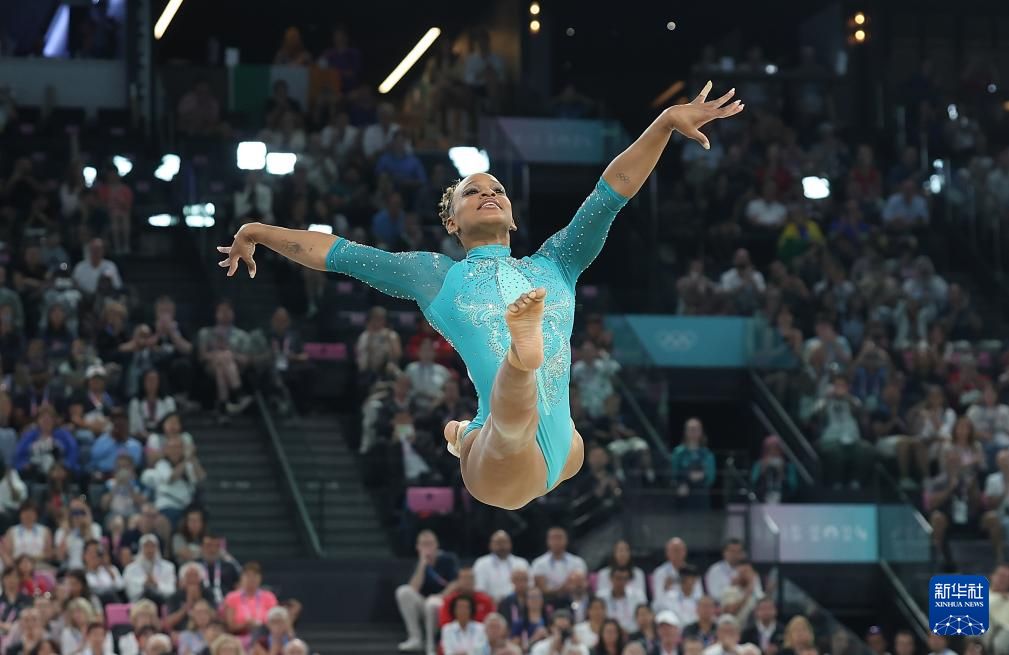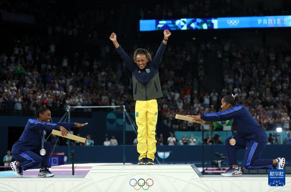 8月5日,巴黎奥运会体操项目女子自由操决赛在贝尔西体育馆举行,巴西选手安德拉德获得金牌,银牌、铜牌分别由两位美国选手拜尔斯和奇利斯获得。图为安德拉德在比赛中。中新社