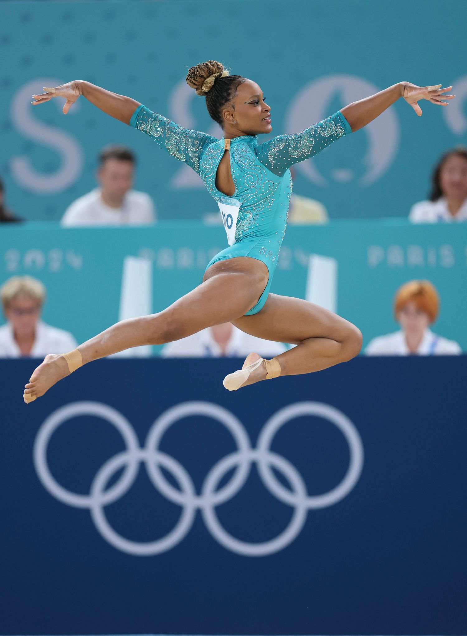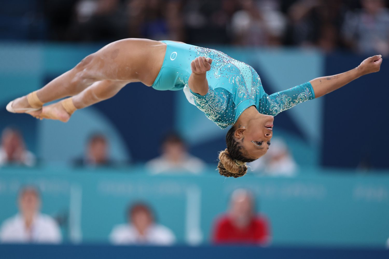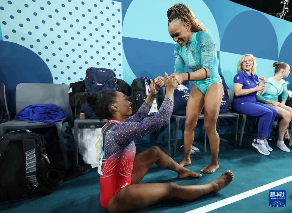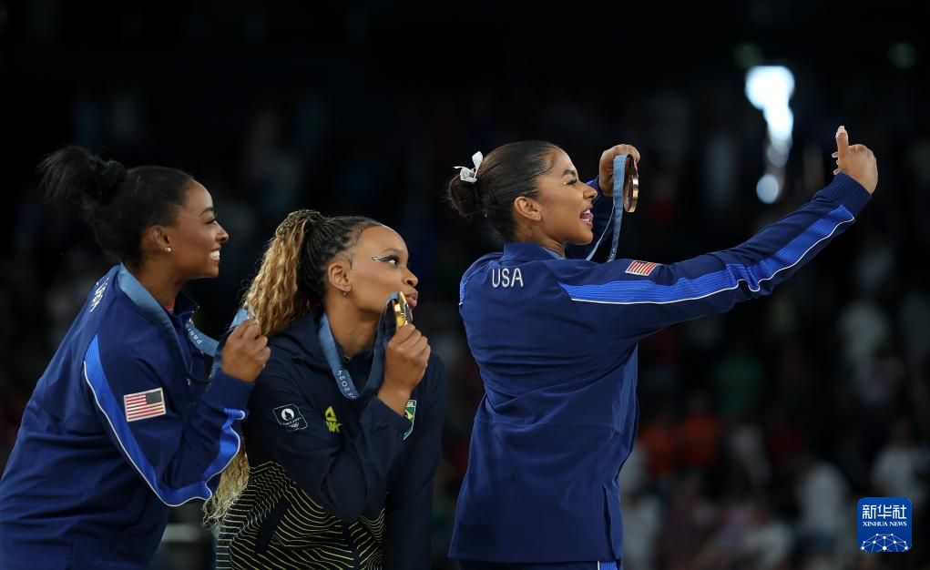 8月5日,巴黎奥运会体操项目女子自由操决赛在贝尔西体育馆举行,巴西选手安德拉德获得金牌,银牌、铜牌分别由两位美国选手拜尔斯和奇利斯获得。图为安德拉德在比赛中。中新社