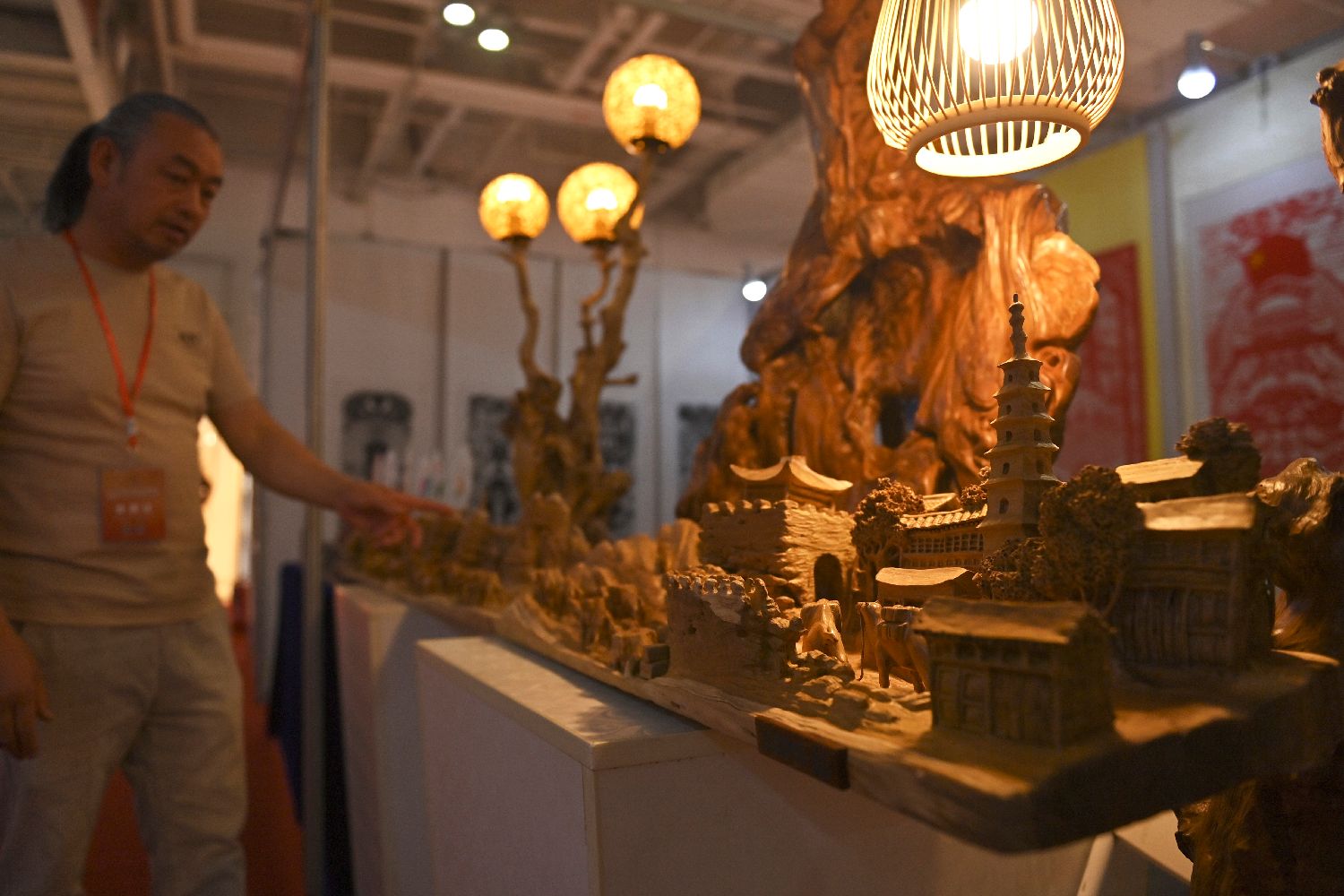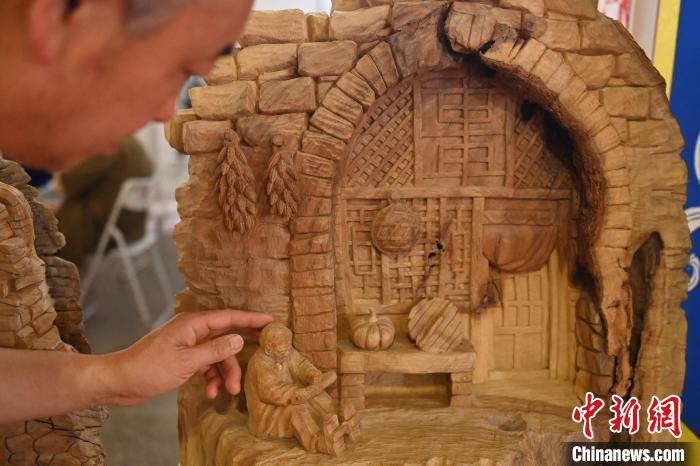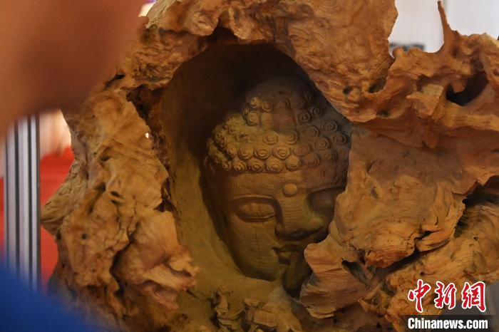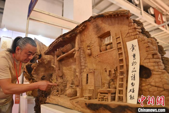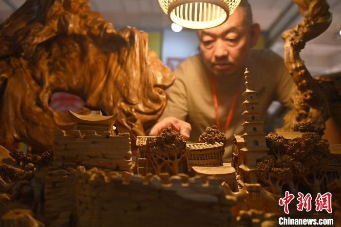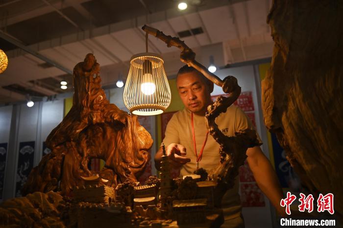 “丝路英萃·陇上遗珠”甘肃非遗交流展上,甘博的根雕作品《又见敦煌》亮相。中新网