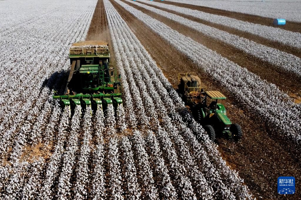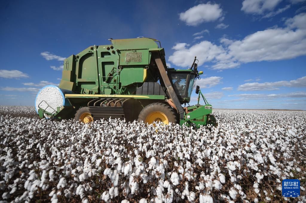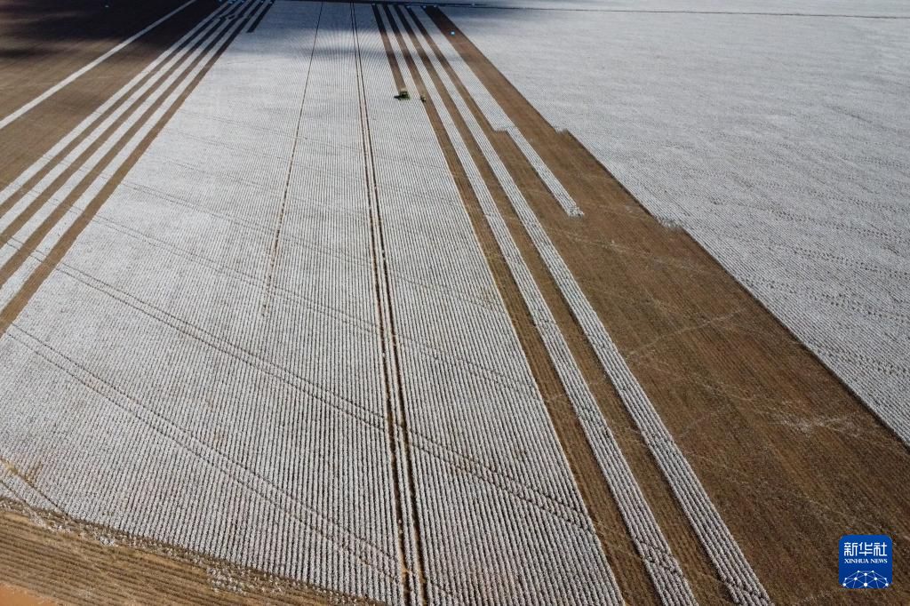 8月是巴西棉花收获季,许多农场在这个时间段进行大规模的棉花收割。图为8月6日,在巴西戈亚斯州克里斯塔利娜,采棉机在棉田中作业(无人机照片)。