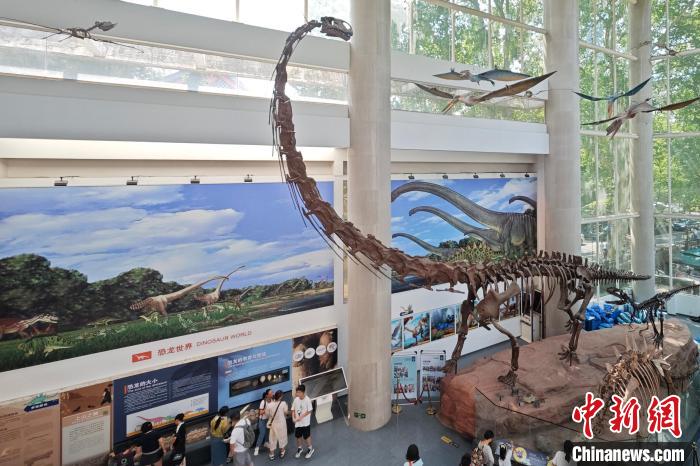 8月8日,观众在南京古生物博物馆内参观合川马门溪龙等恐龙骨骼。中新网