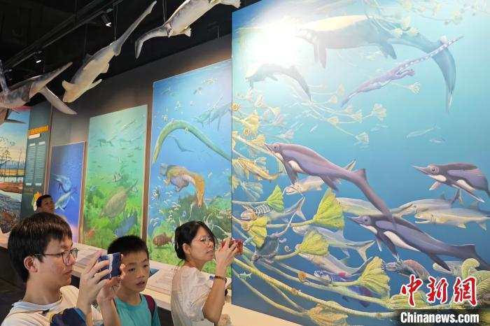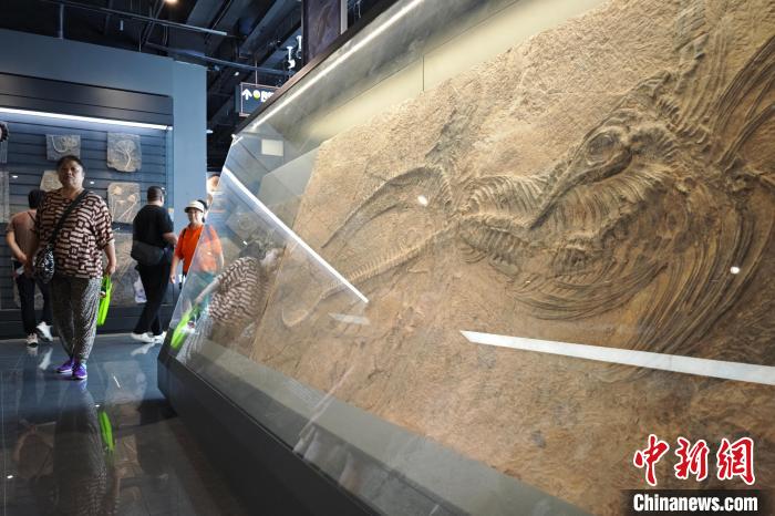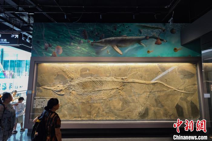 8月8日,观众在南京古生物博物馆内参观周氏黔鱼龙化石 。中新网
