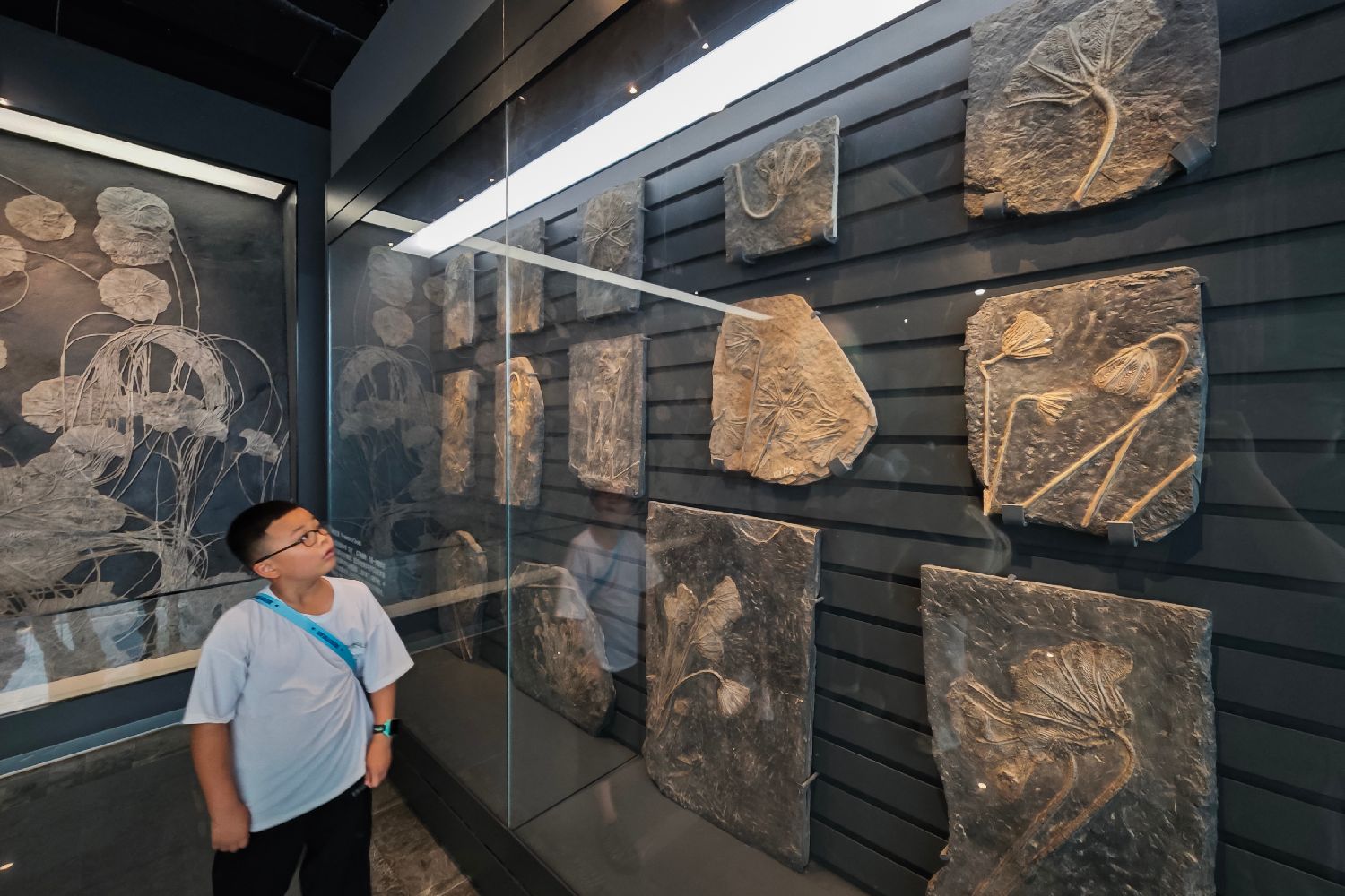 8月8日,孩子在南京古生物博物馆内参观海百合化石标本。中新社