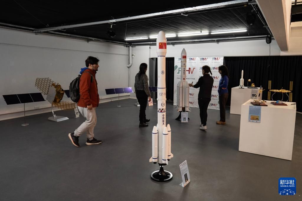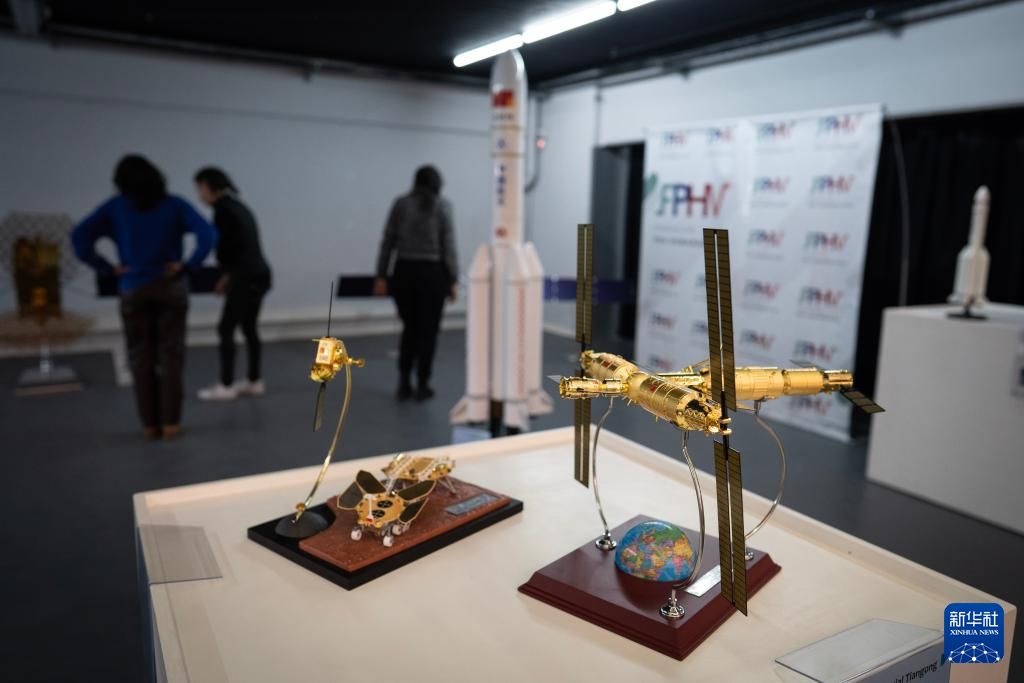 8月8日,在阿根廷拉普拉塔国立大学艺术中心拍摄的“中国航空科技展”展出的天问一号探测器(左)和中国“天宫”空间站(右)的模型。