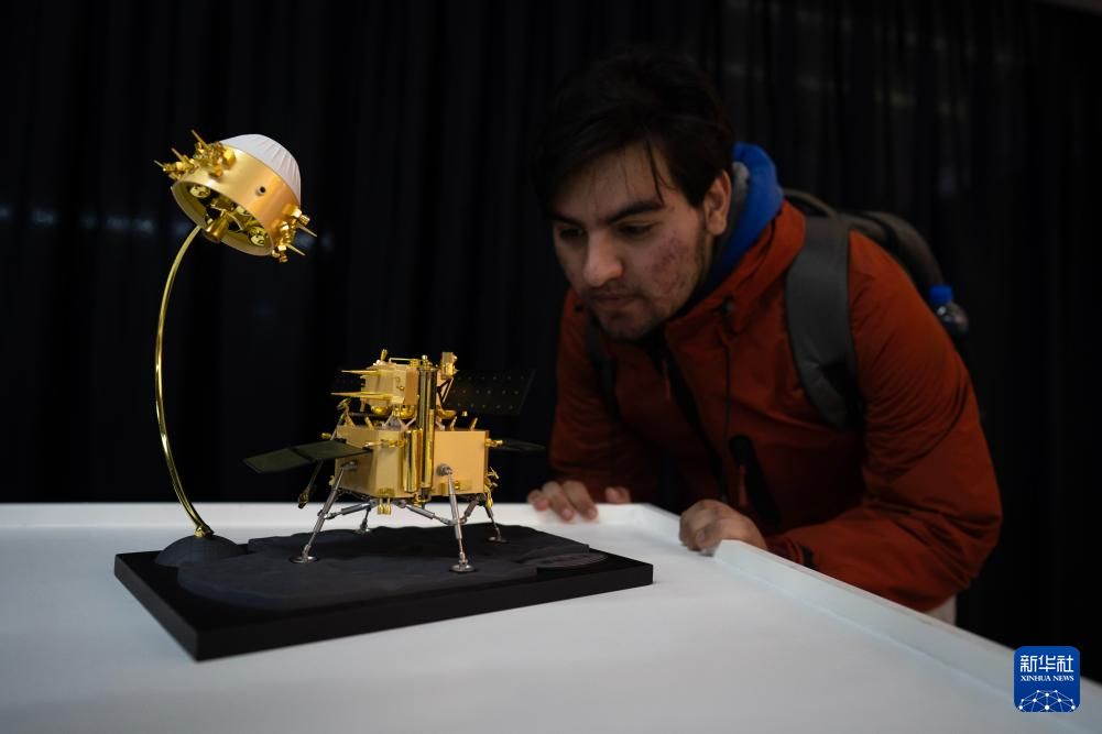8月8日,一名男子在在阿根廷拉普拉塔国立大学艺术中心举办的“中国航空科技展”上观看嫦娥五号探测器的模型。