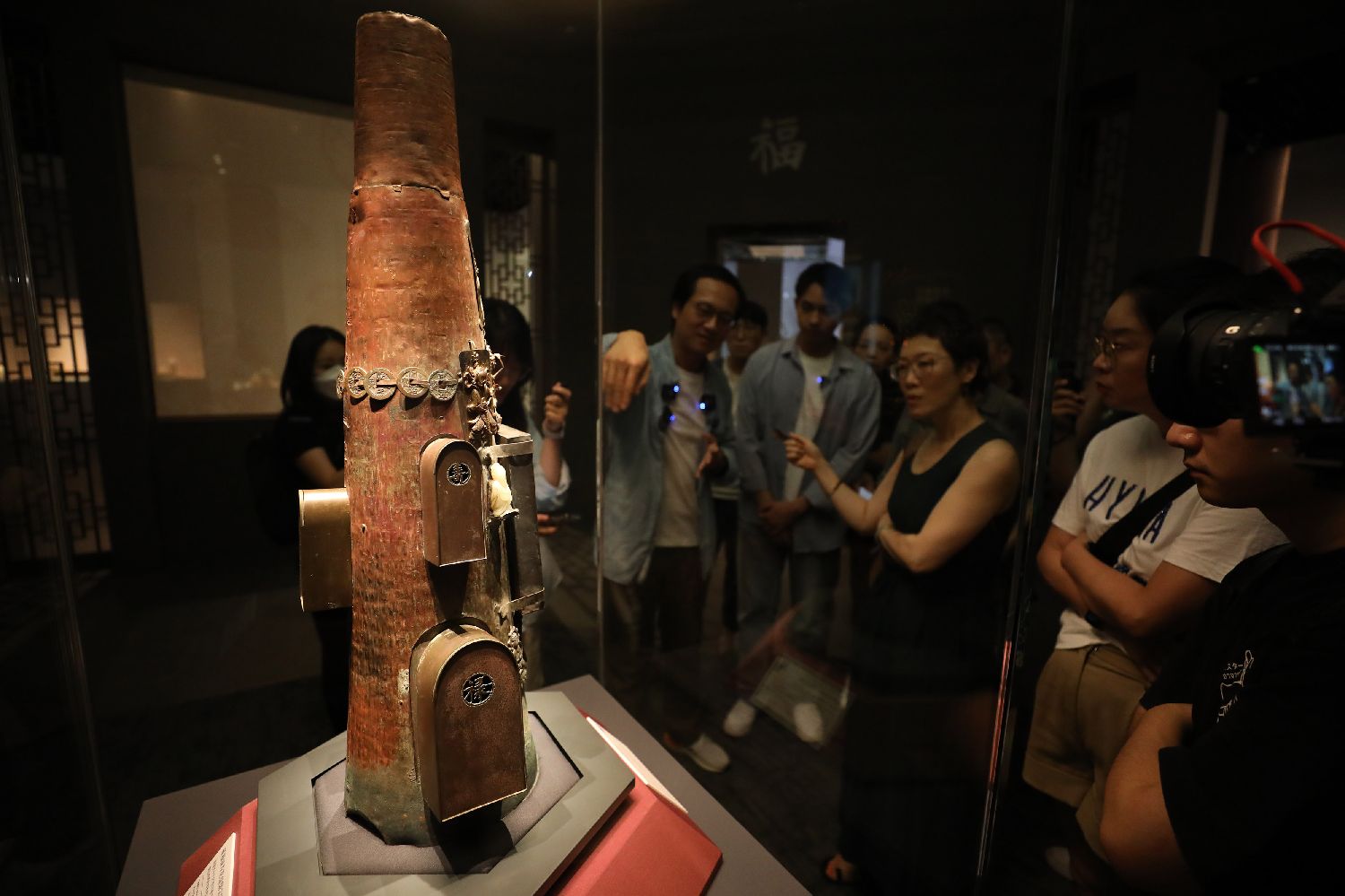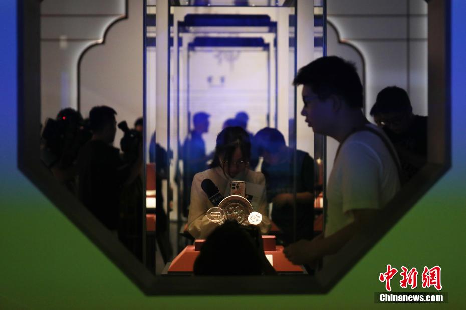 8月13日,媒体人员在拍摄嵌福禄寿喜盒铜宝珠内胆。新华社